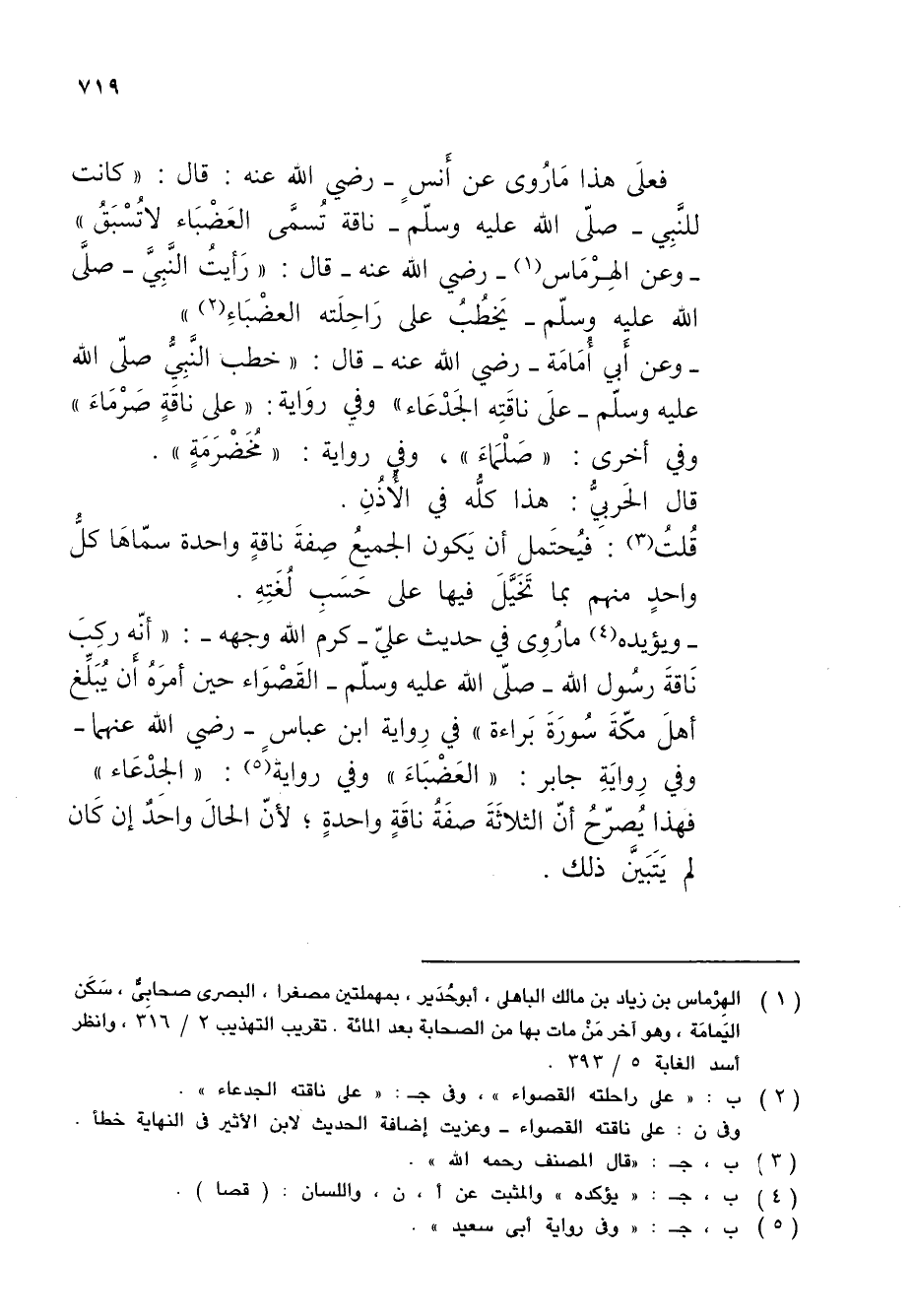 - ويؤيده (¬4) ما رُوِى في حديث عليّ - كرم الله وجهه -: "أنّه ركِبَ نَاقةَ رسُول الله - صلّى الله عليه وسلّم - القَصْوَاء حين أمرَهُ أَن يُبَلِّغ أهلَ مكّةَ سُورَةَ بَراءة" في رِواية ابن عباسٍ - رضي الله عنهما - وفي رِوايَةِ جابر: "العَضْبَاءَ" وفي رواية (¬5): "الجدْعَاء" فهذا يُصرّحُ أنّ الثلاثَةَ صفَةُ ناقَةٍ واحدةٍ؛ لأنّ الحالَ واحَدٌ إن كَان لم يَتَبَيَّن ذلك.