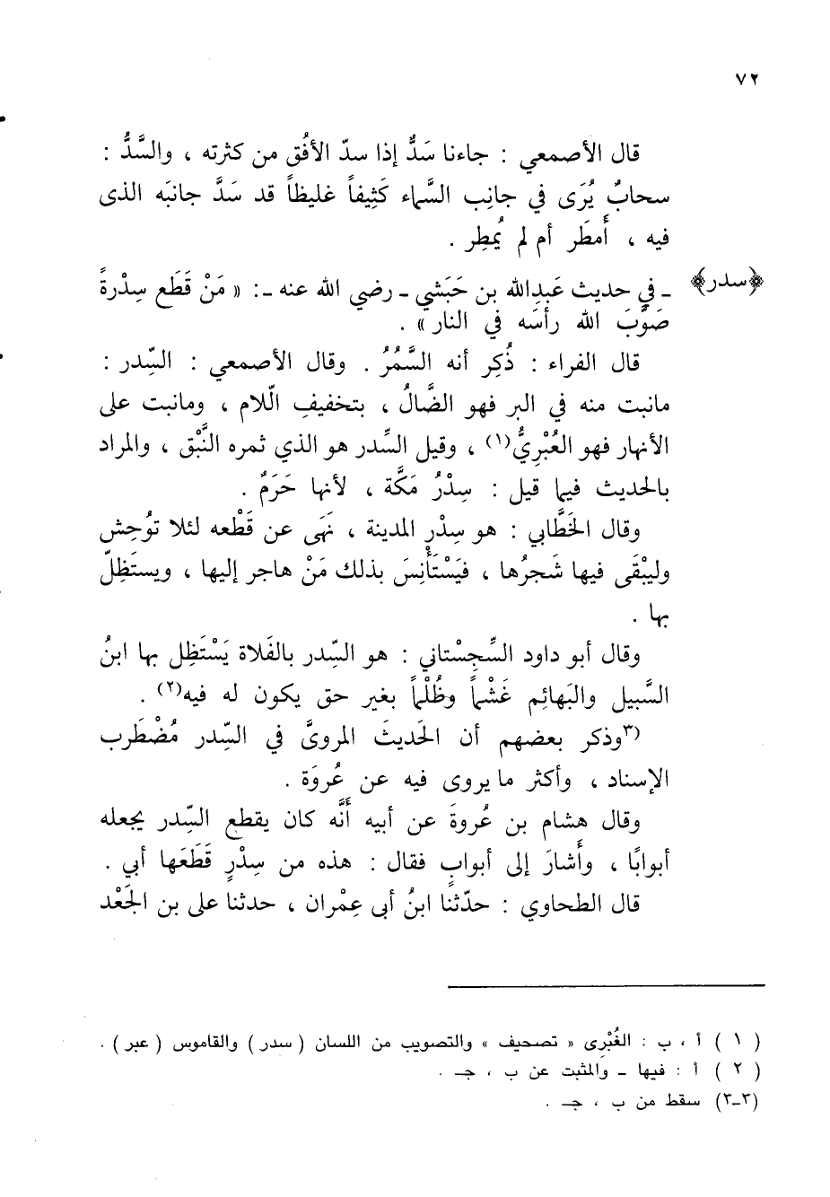 (3 وذكر بعضهم أن الحَديثَ المرويَّ في السِّدر مُضْطَرب الإسناد، وأكثر ما يروى فيه عن عُروَة.
