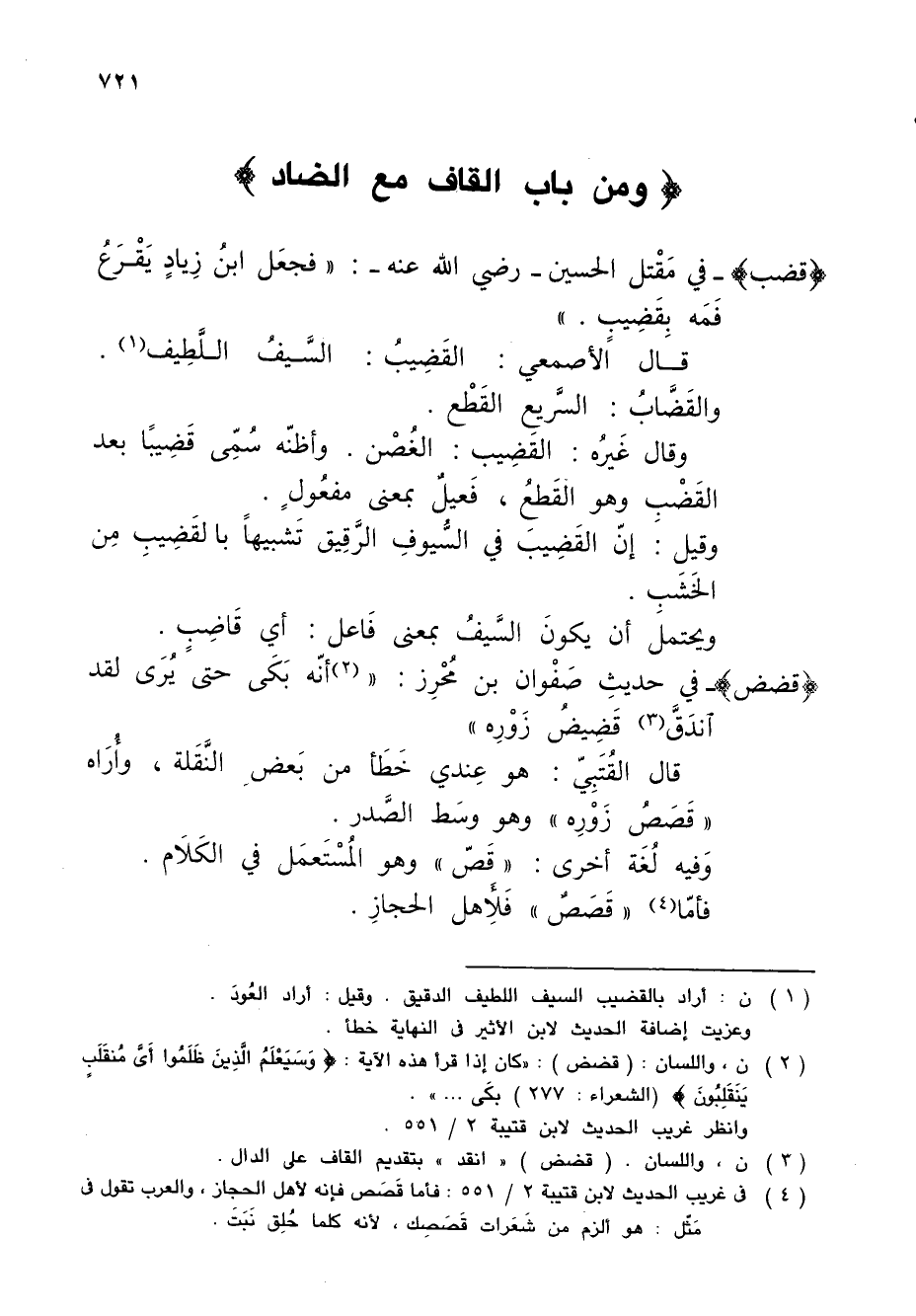 (قضب) - في مَقْتل الحسين - رضي الله عنه -: "فجعَل ابنُ زِيادٍ يَقْرَعُ فَمَه بِقَضِيبٍ."
