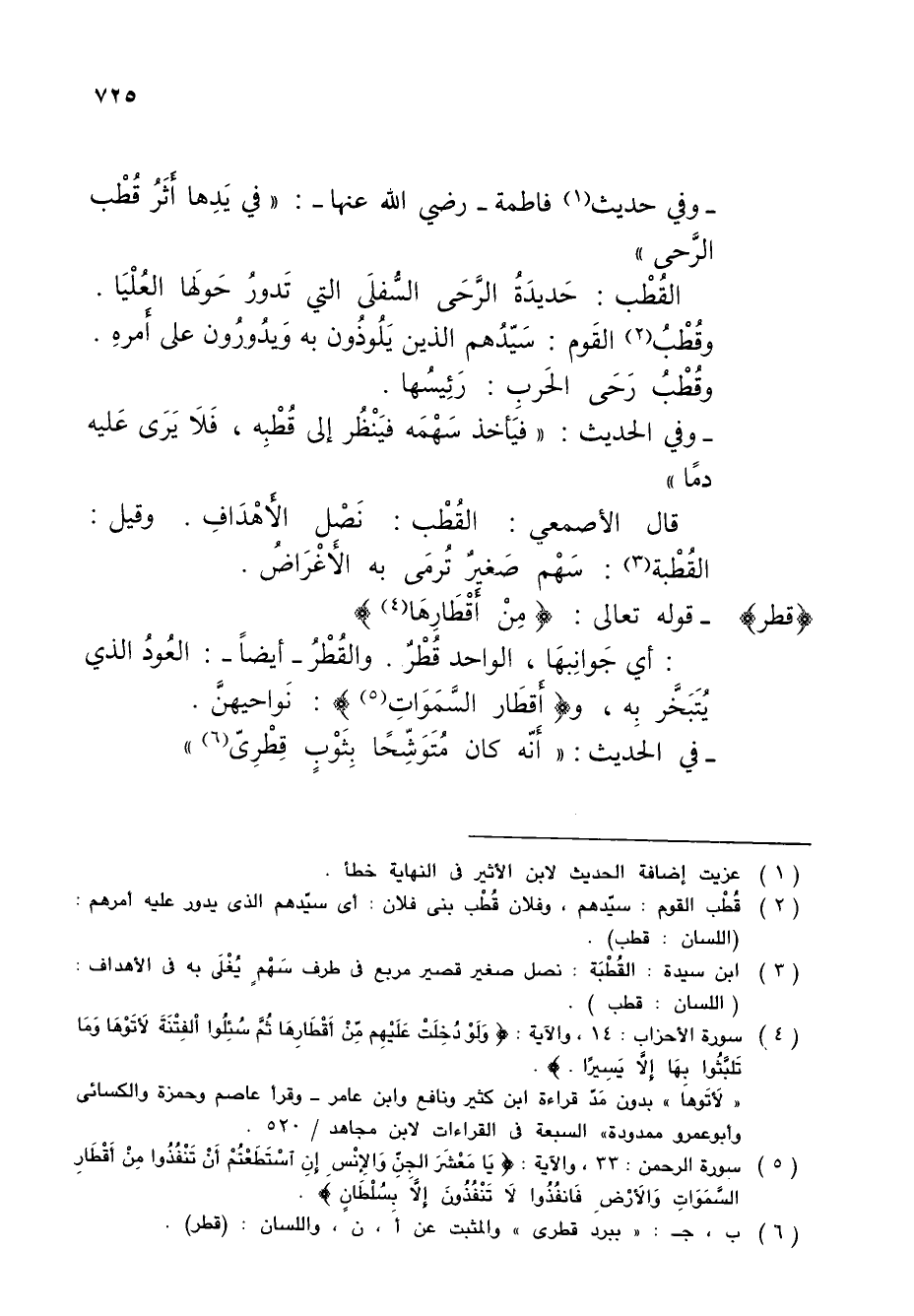القُطْب: حَديدَةُ الرَّحَى السُّفلَى التي تَدورُ حَولَها العُلْيَا. وقُطْبُ (¬2) القَوم: سَيّدُهم الذين يَلُوذُون به وَيدُورُون على أَمرهِ. وقُطْبُ رَحَى الحَربِ: رَئِيسُها.