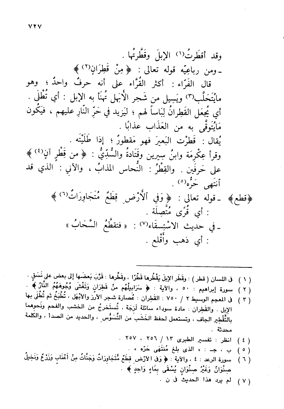 (¬3) في المعجم الوسيط 2/ 750: القَطِران: عُصارة شجر الأرز والأبْهَل، تُطْبَخُ ثم تُطْلَى بها الِإبل. والقَطِران: مادة سوداء سائلة لَزِجَة، تُستَخرجُ من الخشب والفحم ونَحوِهما بالتَّقْطِير الجاف، وتستعمل لحفظ الخَشَب من التَّسَوُّسِ، والحديد من الصدأ، والكلمة محدثة.