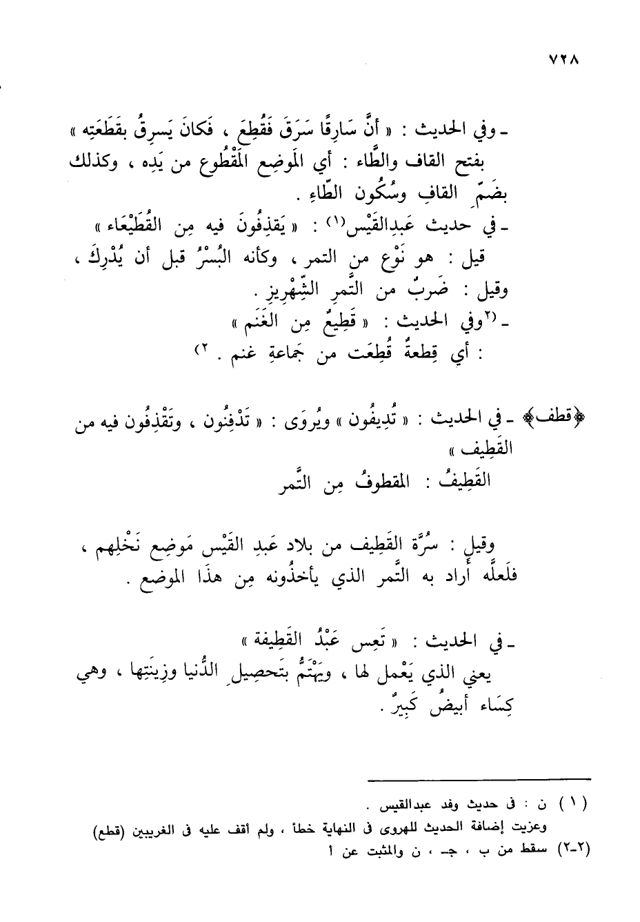 بفتح القاف والطَّاء: أي المَوضِع المَقْطُوع من يَدِه، وكذلك بضَمِّ القافِ وسُكُون الطّاءِ.