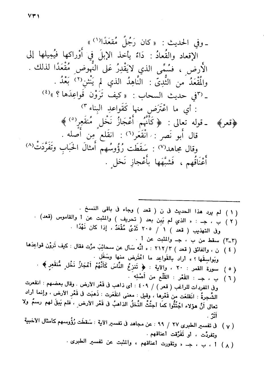 (قعر) - قوله تعالى: {كَأَنَّهُمْ أَعْجَازُ نَخْلٍ مُنْقَعِرٍ} (¬5)