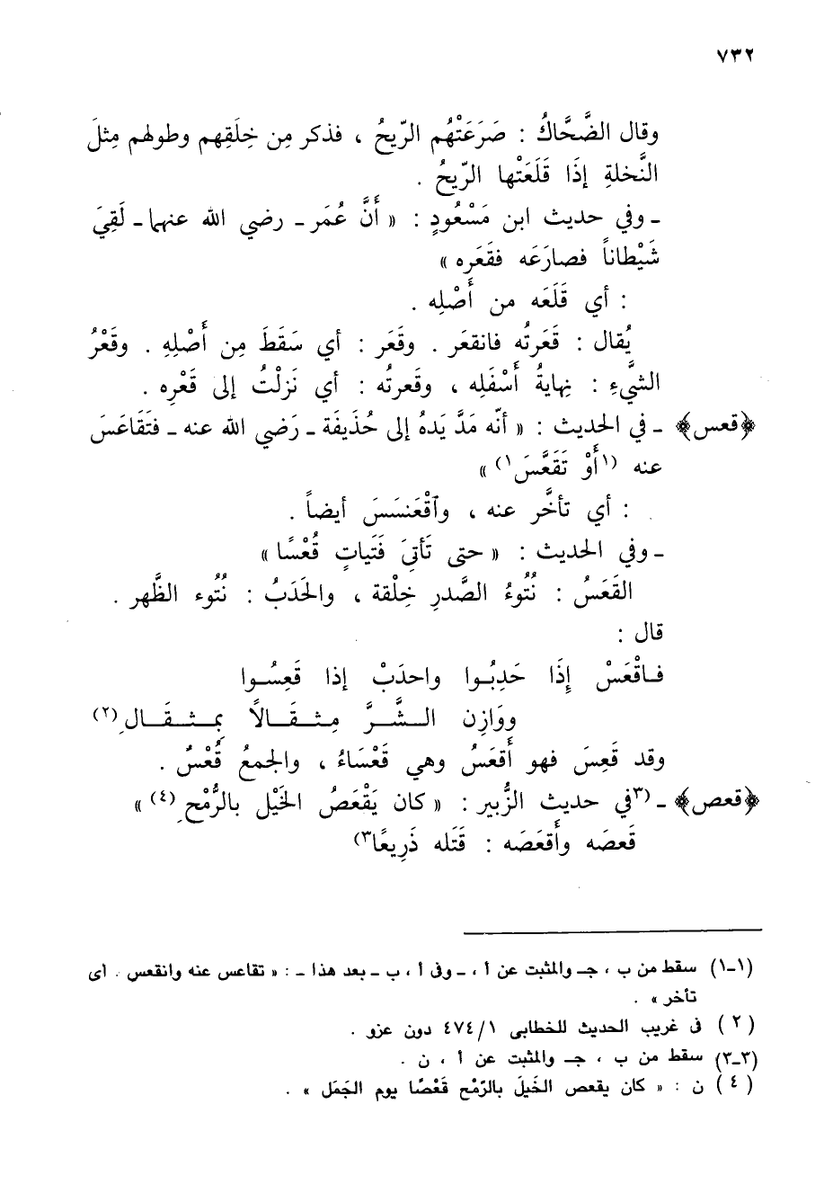 (قعص) - (3 في حديث الزُّبير: "كان يَقْعَصُ الخَيْل بالرُّمْحِ (¬4) " قَعصَه وأَقعَصَه: قَتَله ذَرِيعًا 3)