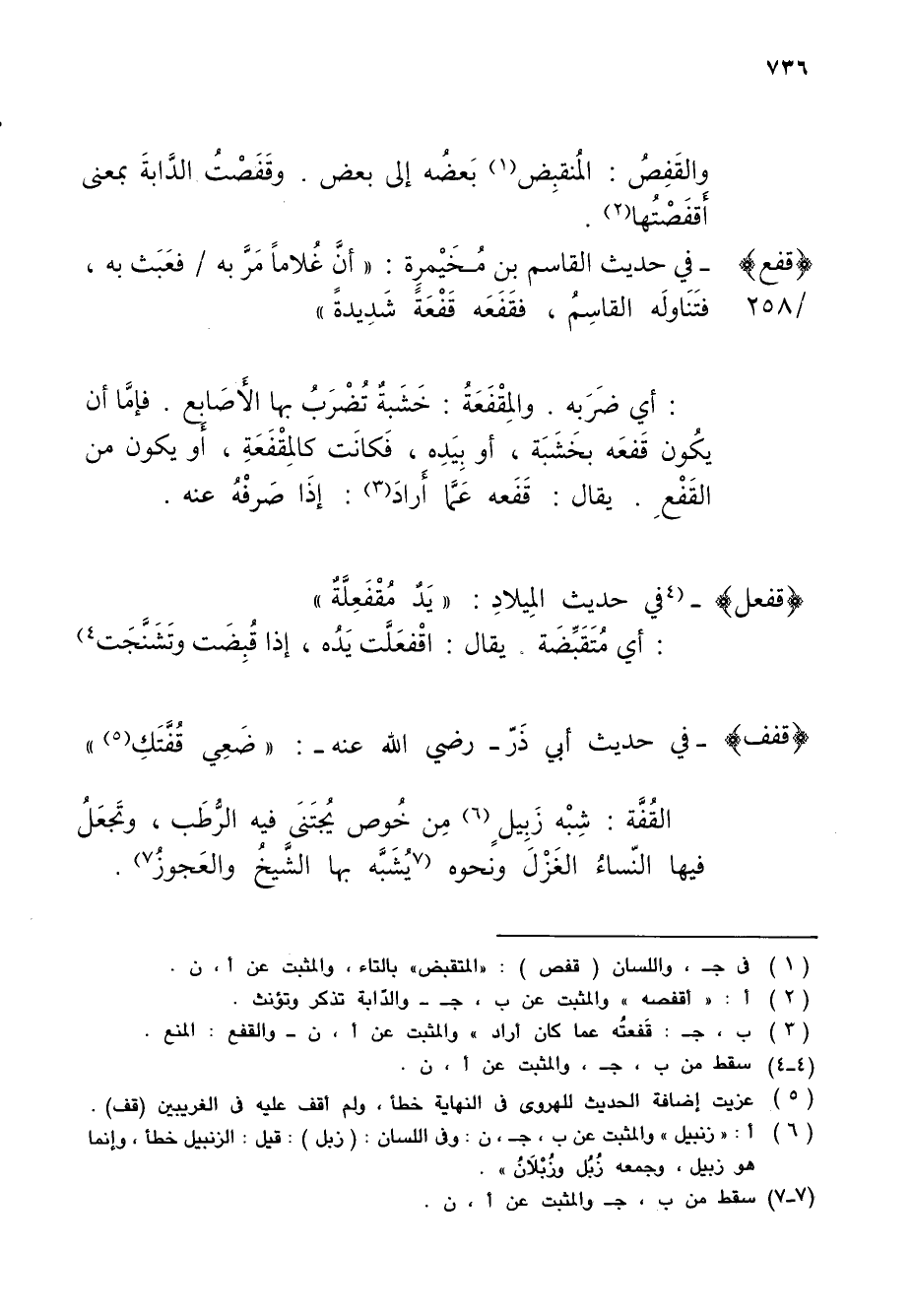 (¬5) عزيت إضافة الحديث للهروى في النهاية خطأ، ولم أقف عليه في الغريبين (قف).