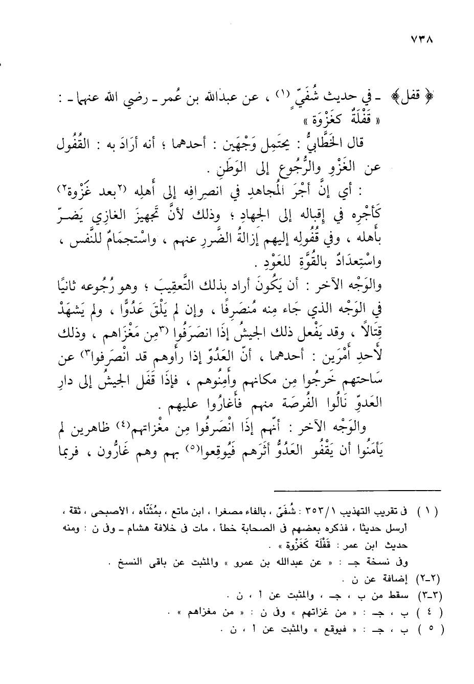 (¬1) في تقريب التهذيب 1/ 353: شُفَىّ، بالفاء مصغرا، ابن ماتع، بمُثَنّاه، الأصبحى، ثقة، أرسل حديثاً، فذكره بعضهم في الصحابة خطأ، مات في خلافة هشام - وفي ن: ومنه حديث ابن عمر: قَفْلَة كَغَزْوة".