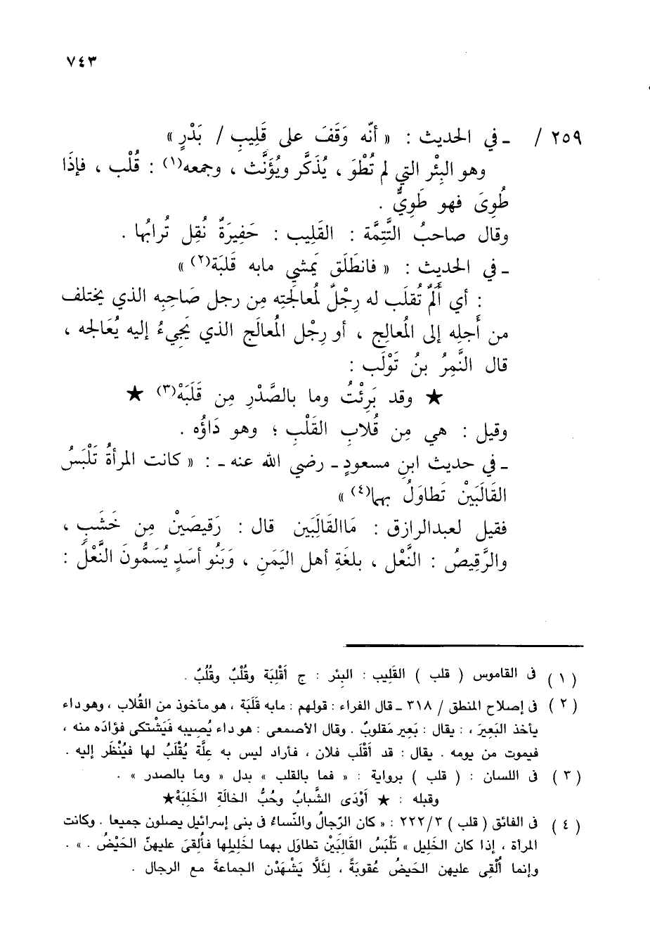 (¬4) في الفائق (قلب) 3/ 222: "كان الرّجالُ والنَساءُ في بنى إسرائيل يصلون جميعاً. وكانت المرأة، إذا كان الخَلِيل" تَلْبَسُ القَالِبَينْ تطاوَل بهما لخَلِيلها فأُلِقىَ عليهنّ الحَيْضُ.".