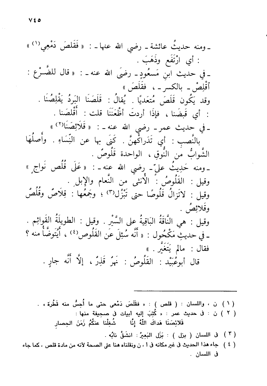 (¬4) جاء هذا الحديث في غير مكانه في أ، ن ونقلناه هنا على الصحة لأنه من مادة قلص، كما جاء في اللسان.