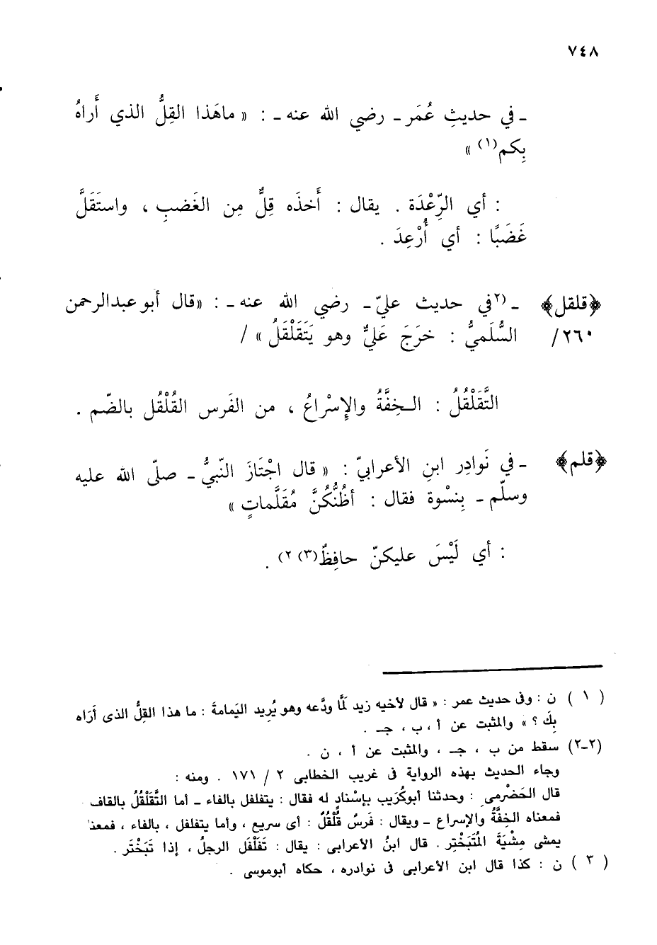 (¬1) ن: وفي حديث عمر: "قال لأخيه زيد لَمَّا ودَّعه وهو يُرِيد اليَمامةَ: ما هذا القِلُّ الذي أَرَاه بِكَ؟ " والمثبت عن أ، ب، جـ.