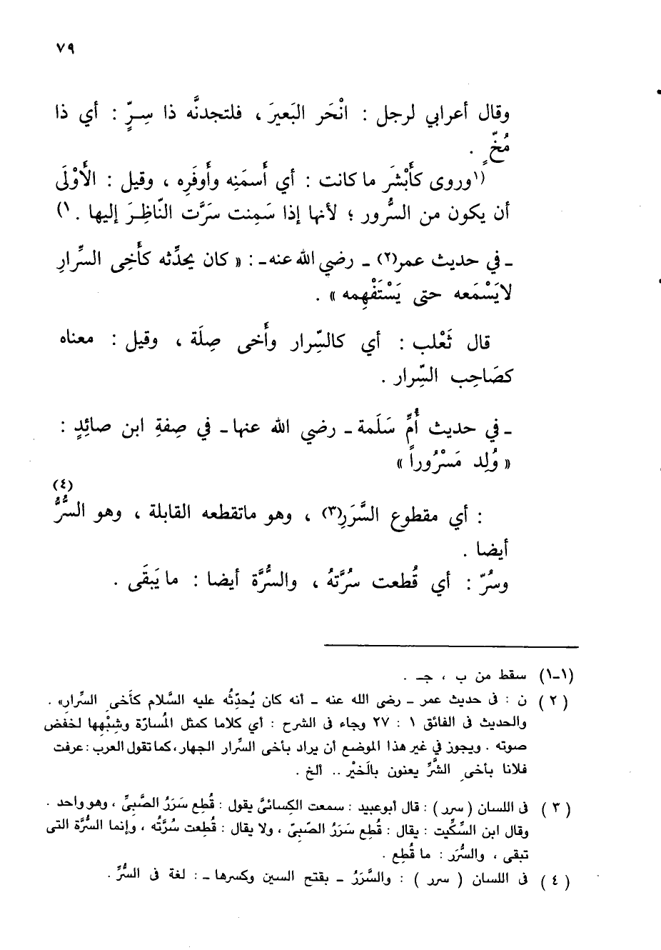 (¬2) ن: في حديث عمر - رضي الله عنه - أنه كان يُحدَّثُه عليه السَّلام كأَخىِ السَّرارِ". والحديث في الفائق 1: 27 وجاء في الشرح: أي كلاما كمثل المُسارّة وشِبْهِها لخفَض صوته. ويجوز في غير هذا الموضع أن يراد بأخى السَّرار الجهار، كما تقول العرب: عرفت فلانا بأخىِ الشَّرَّ يعنون بالخَيْر .. ألخ.