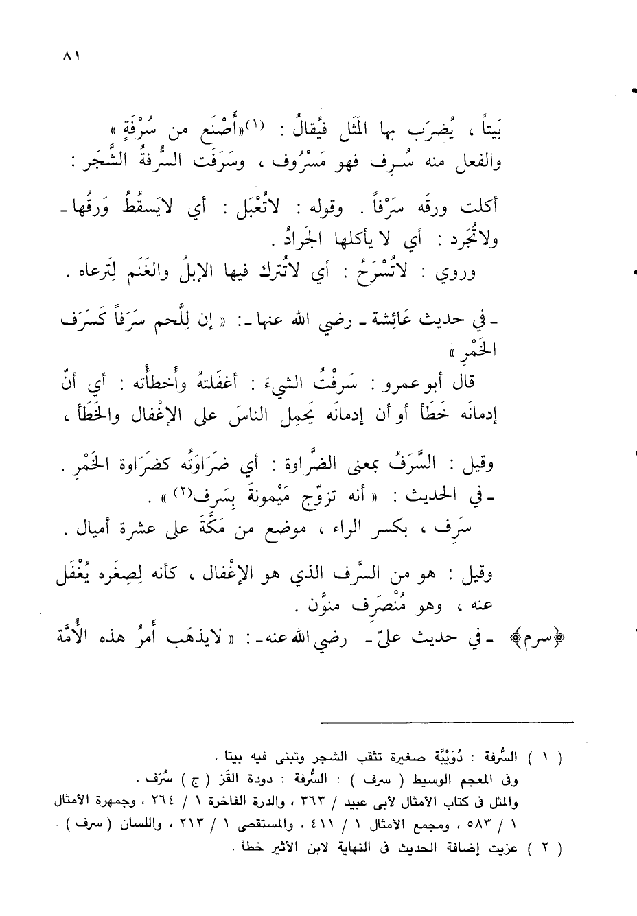 والمثل في كتاب الأمثال لأبى عبيد/ 363، والدرة الفاخرة 1/ 264، وجمهرة الأمثال 1/ 583، ومجمع الأمثال 1/ 411، والمستقصى 1/ 213، واللسان (سرف).