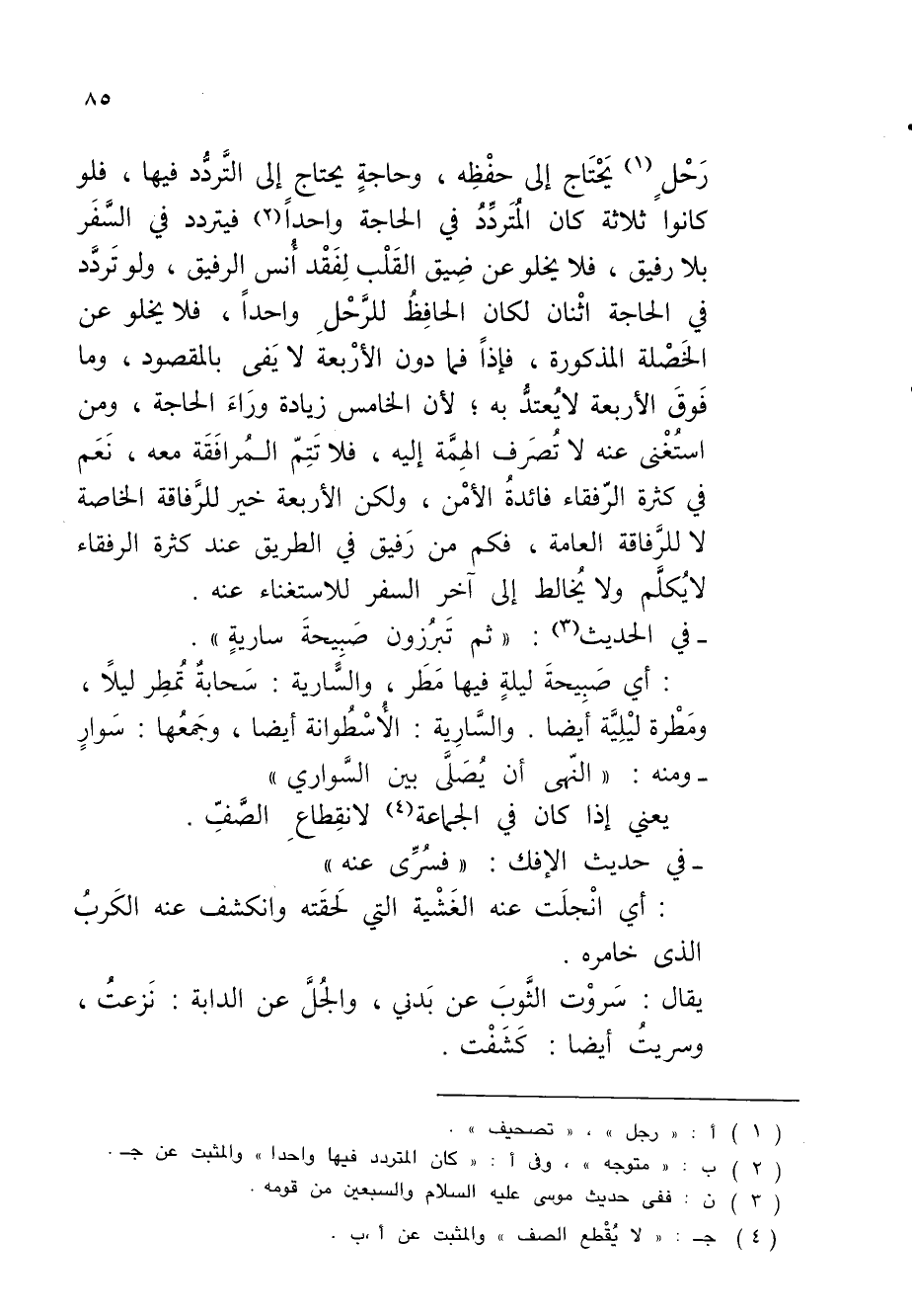 رَحْلٍ (¬1) يَحْتَاج إلى حفْظِه، وحاجةٍ يحتاج إلى التَّردُّد فيها، فلو كانوا ثلاثة كان المُتَردَّدُ في الحاجة واحداً (¬2) فيتردد في السَّفَر بلا رفيق، فلا يخلو عن ضِيق القَلْب لِفَقْد أُنس الرفيق، ولو تَردَّد في الحاجة اثْنان لكان الحافِظُ للرَّحْلِ واحداً، فلا يخلو عن الخَصْلة المذكورة، فإذاً فما دون الأرْبعة لا يَفى بالمقصود، وما فَوقَ الأربعة لا يُعتدُّ به؛ لأن الخامس زيادة ورَاءَ الحاجة، ومن استُغْنى عنه لا تُصَرف الهِمَّة إليه، فلا تَتِمّ المُرافَقَة معه، نَعَم في كثرة الرّفقاء فائدةُ الأمْن، ولكن الأربعة خير للرَّفاقة الخاصة لا للرَّفاقة العامة، فكم من رَفيق في الطريق عند كثرة الرفقاء لا يُكلَّم ولا يُخالط إلى آخر السفر للاستغناء عنه.