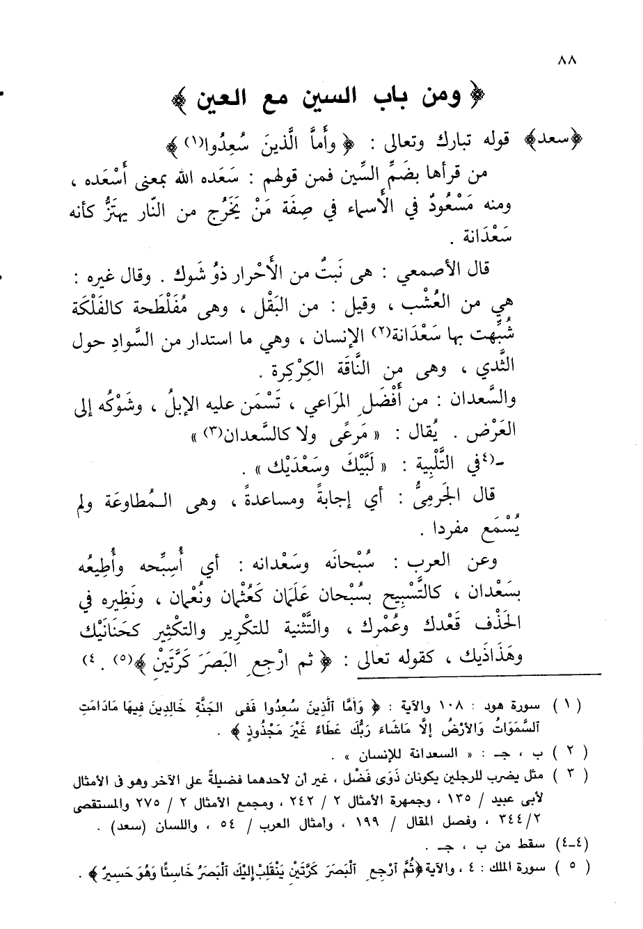 وعن العرب: سُبْحانَه وسَعْدانه: أي أُسِبِّحه وأُطِيعُه بسَعْدان، كالتَّسْبِيح بسُبْحان عَلَمَان كَعُثْمان ونُعْمان، ونَظِيره في الحَذْف قَعْدك وعُمْرك، والتَّثْنية للتكْرِير والتكْثير كحَنَانَيْك وهَذَاذَيك، كقوله تعالى: {ثُمَّ ارْجِعِ الْبَصَرَ كَرَّتَيْنِ} (¬5). 4)