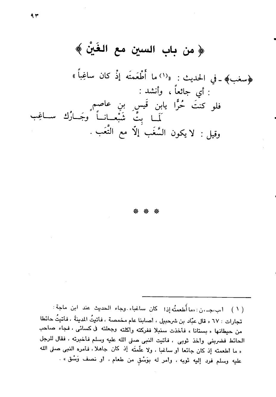 (¬1) أ، ب، جـ، ن: "ما أطعمتُه إذا كان ساغبا". وجاء الحديث عند ابن ماجة: تجارات: 67 "قال عبّاد بن شرحبيل، أصابنا عام مخمصة، فأتيتُ المدينةَ، فأتيتُ حائطا من حيطانها "بستانا" فأخذت سنبلا ففركته وأكلته وجعلته في كسائى، فجاء صاحب الحائط فضربنى وأخذ ثوبى، فأتيت النبى صلى الله عليه وسلم فأخبرته، فقال للرجل "ما أطعمته إذ كان جائعا أو ساغبا، ولا علّمتَه إذ كان جاهلا، فأمره النبى صلى الله عليه وسلم فرد إليه ثوبه، وأمر له بوَسْقٍ من طعام، أو نصف وَسْق".