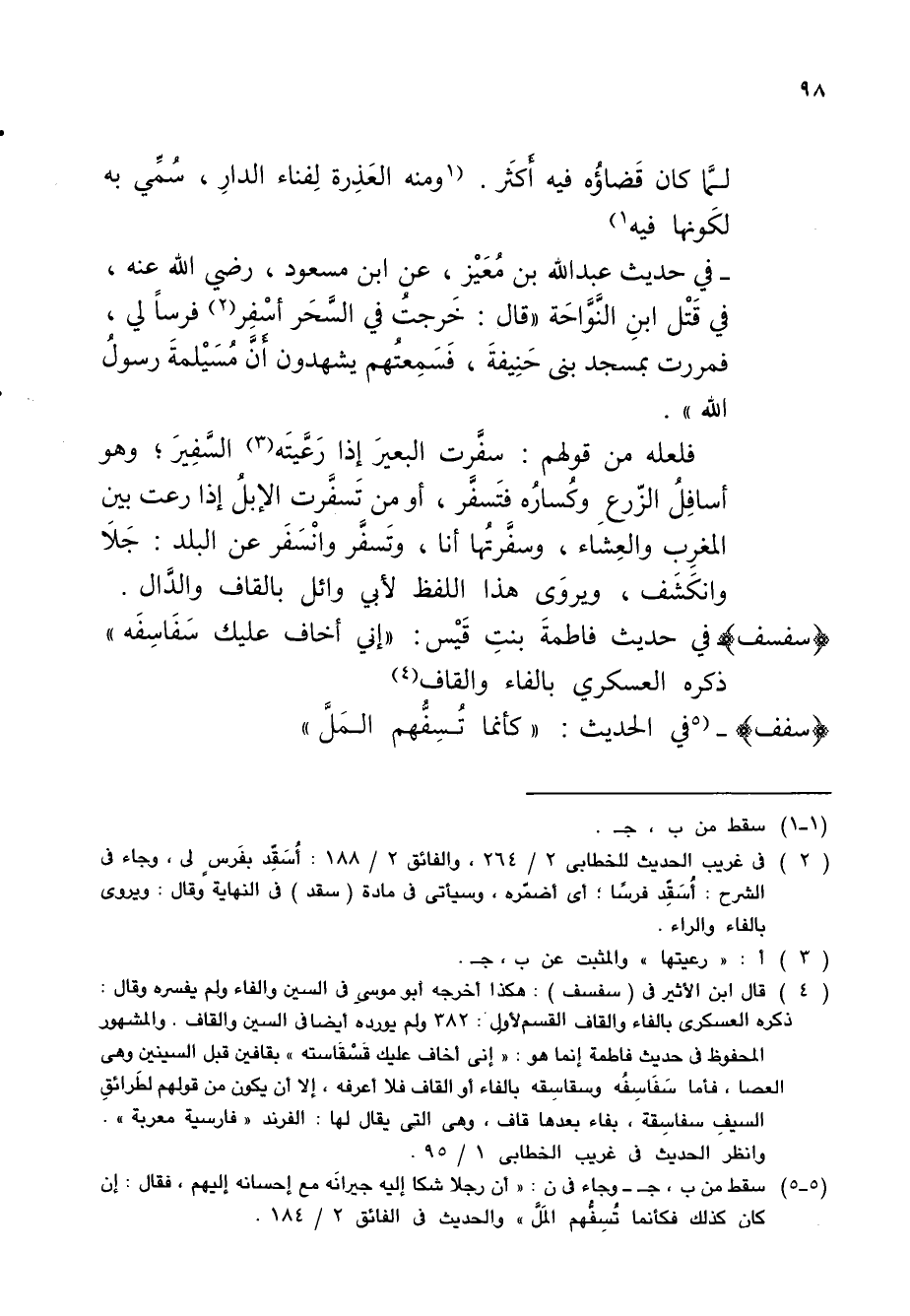 (¬4) قال ابن الأثير في (سفسف): هكذا أخرجه أبو موسى في السين والفاء ولم يفسره وقال: ذكره العسكري بالفاء والقاف القسم الأول: 382 ولم يورده أيضا في السين والقاف. والمشهور المحفوظ في حديث فاطمة إنما هو: "إني أخاف عليك قسْقاسته" بقافين قبل السينين وهي العصا، فأما سَفَاسِفُه وسقاسِقه بالفاء أو القاف فلا أعرفه، إلا أن يكون من قولهم لطَرائقِ السيفِ سفاسِقة، بفاء بعدها قاف، وهي التي يقال لها: الفرند "فارسية معربة". وانظر الحديث في غريب الخطابى 1/ 95.