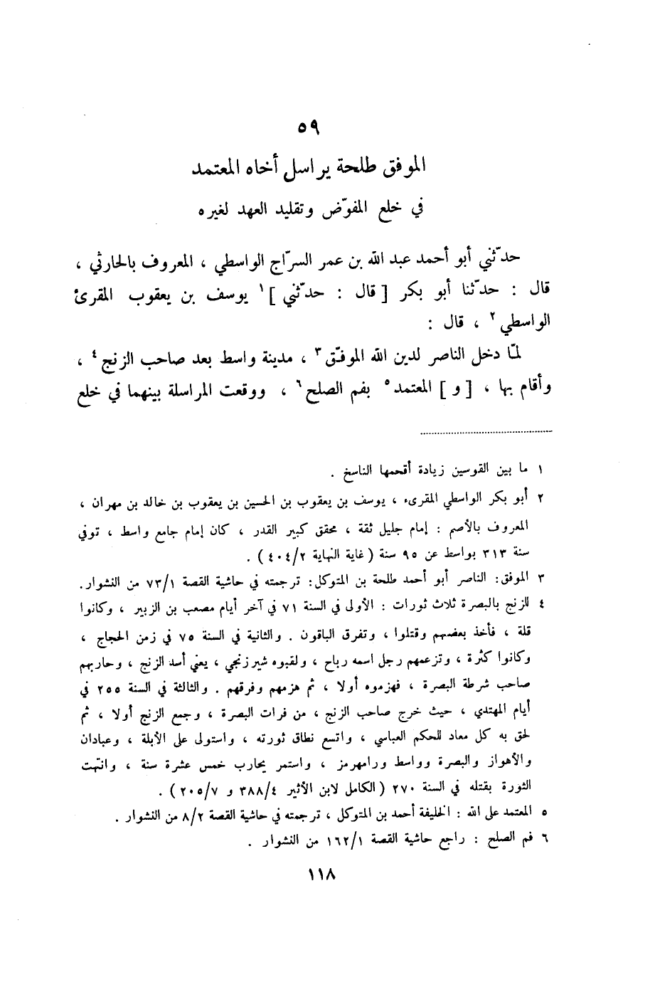 59 الموفق طلحة يراسل أخاه المعتمد في خلع المفوّض وتقليد العهد لغيره