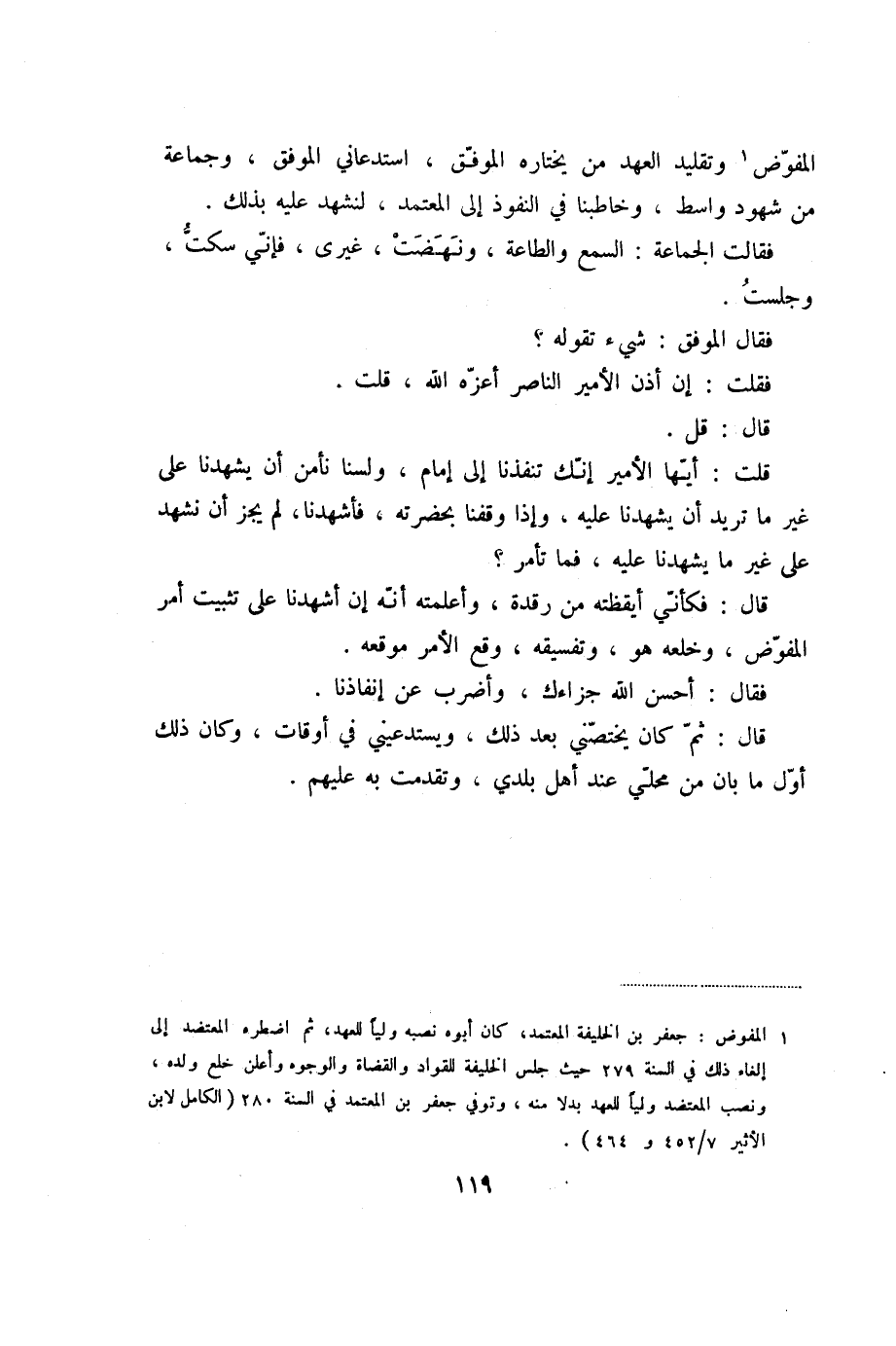 المفوّض «1» وتقليد العهد من يختاره الموفق، استدعاني الموفق، وجماعة من شهود واسط، وخاطبنا في النفوذ إلى المعتمد، لنشهد عليه بذلك.