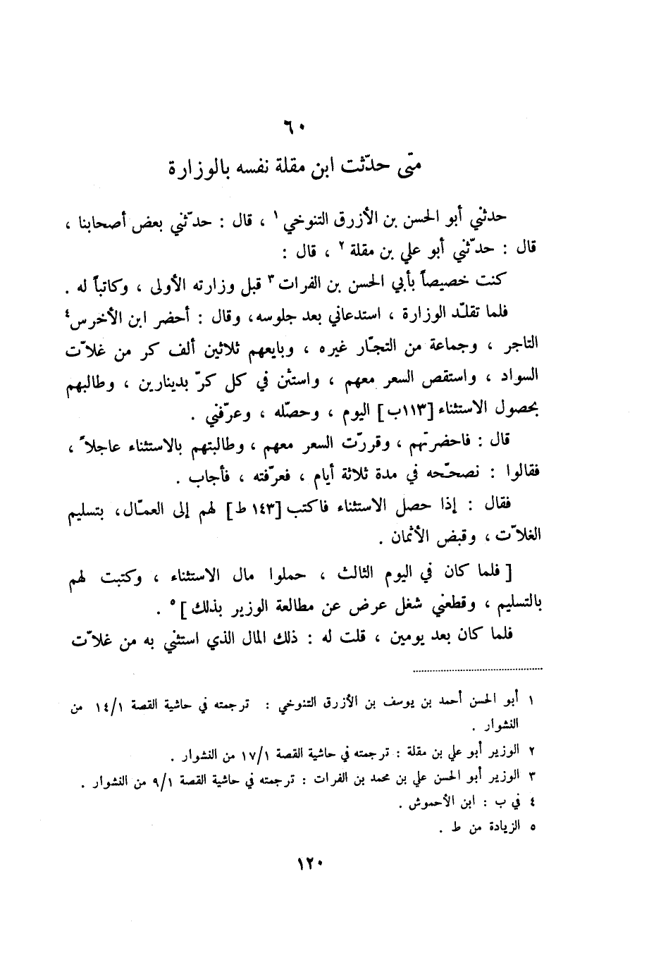 فلما تقلّد الوزارة، استدعاني بعد جلوسه، وقال: أحضر ابن الأخرس «4» التاجر، وجماعة من التجّار غيره، وبايعهم ثلاثين ألف كر من غلّات السواد، واستقص السعر معهم، واستثن في كل كرّ بدينارين، وطالبهم بحصول الاستثناء [113 ب] اليوم، وحصّله، وعرّفني.