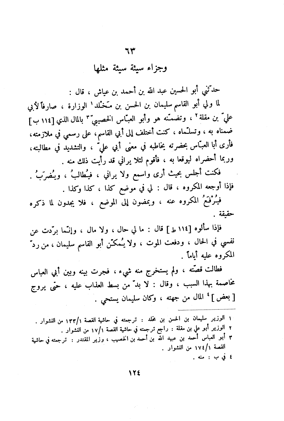 لما ولي أبو القاسم سليمان بن الحسن بن مخلد «1» الوزارة، صارفا لأبي عليّ بن مقلة «2» ، وتضمّنه هو وأبو العبّاس الخصيبيّ «3» بالمال الذي [114 ب] ضمناه به، وتسلّماه، كنت أختلف إلى أبي القاسم، على رسمي في ملازمته، فأرى أبا العبّاس بحضرته يخاطبه في معنى أبي عليّ، والتشديد في مطالبته، وربما أحضراه ليوقعا به، فأقوم لئلا يراني قد رأيت ذلك منه.