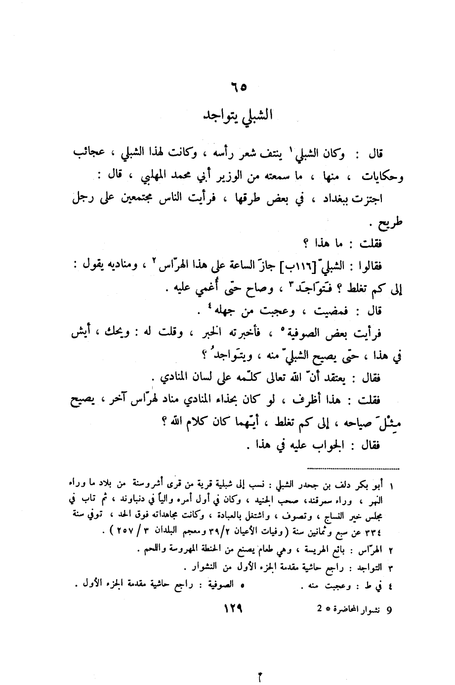 فرأيت بعض الصوفية «5» ، فأخبرته الخبر، وقلت له: ويحك، أيش في هذا، حتى يصيح الشبليّ منه، ويتواجد؟