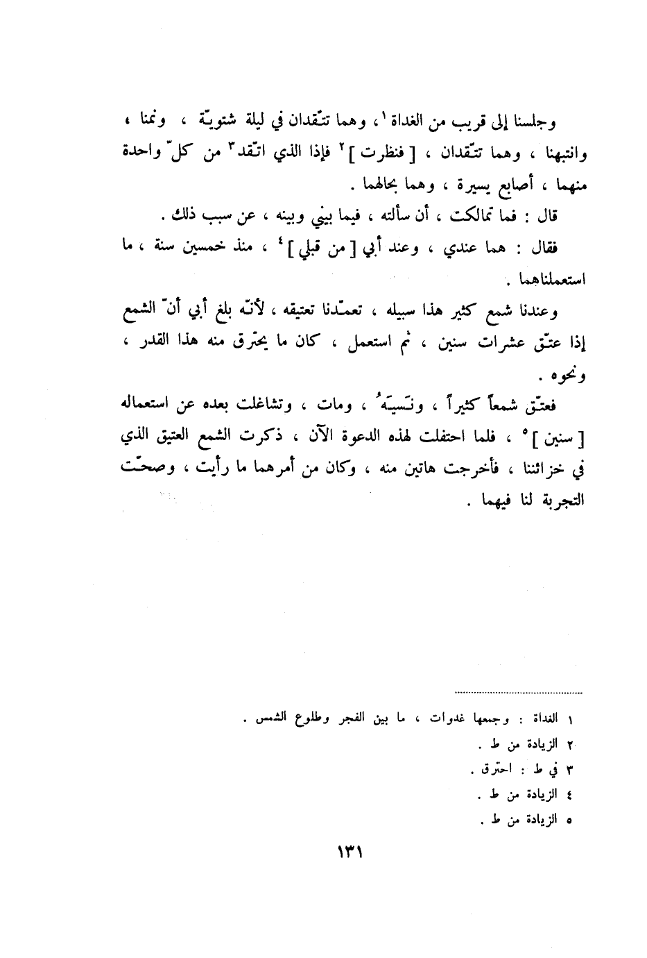 فعتّق شمعا كثيرا، ونسيه، ومات، وتشاغلت بعده عن استعماله [سنين] «5» ، فلما احتفلت لهذه الدعوة الآن، ذكرت الشمع العتيق الذي في خزائننا، فأخرجت هاتين منه، وكان من أمرهما ما رأيت، وصحّت التجربة لنا فيهما.