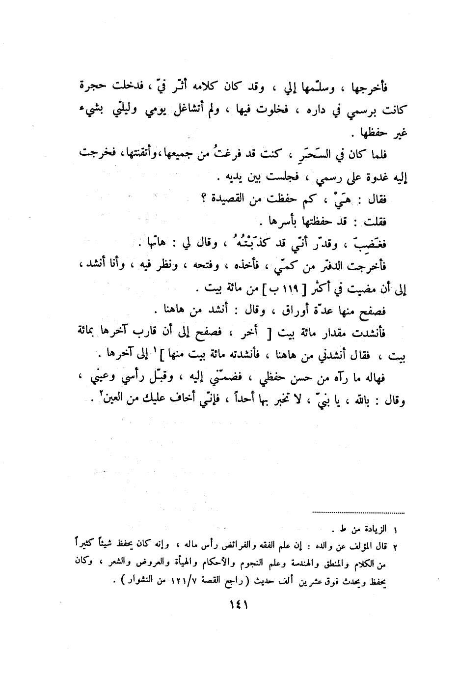 فأخرجت الدفتر من كمّي، فأخذه، وفتحه، ونظر فيه، وأنا أنشد، إلى أن مضيت في أكثر [119 ب] من مائة بيت.