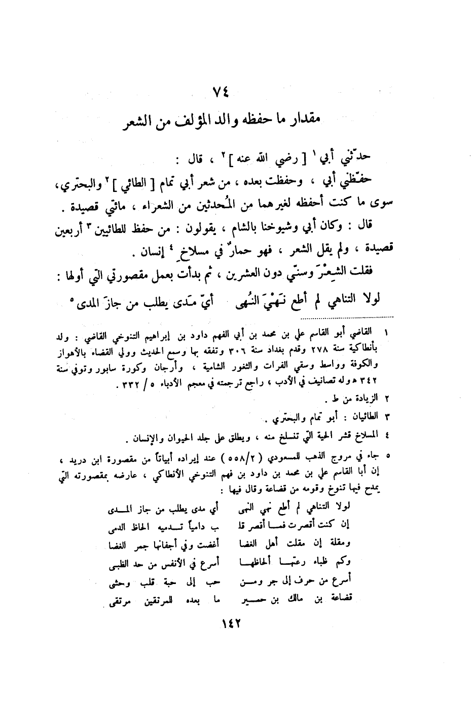 حفّظني أبي، وحفظت بعده، من شعر أبي تمام [الطائي] «3» والبحتري، سوى ما كنت أحفظه لغيرهما من المحدثين من الشعراء، مائتي قصيدة.