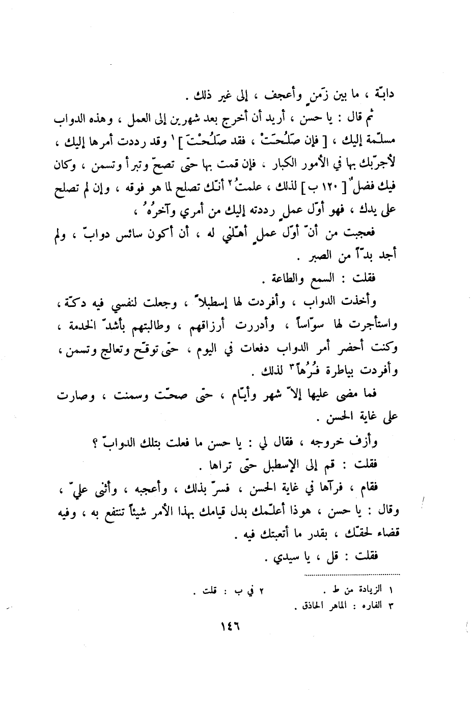 ثم قال: يا حسن، أريد أن أخرج بعد شهرين إلى العمل، وهذه الدواب مسلّمة إليك، [فإن صلحت، فقد صلحت] «1» وقد رددت أمرها إليك، لأجرّبك بها في الأمور الكبار، فإن قمت بها حتى تصحّ وتبرأ وتسمن، وكان فيك فضل [120 ب] لذلك، علمت «2» أنّك تصلح لما هو فوقه، وإن لم تصلح على يدك، فهو أوّل عمل رددته إليك من أمري وآخره، فعجبت من أنّ أوّل عمل أهّلني له، أن أكون سائس دوابّ، ولم أجد بدّا من الصبر.