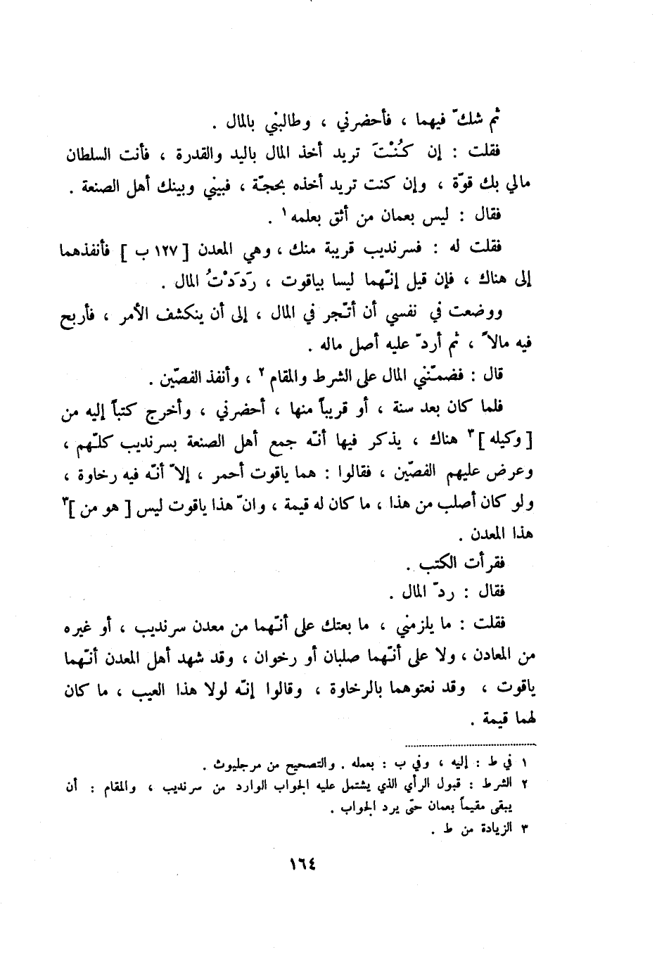 فقلت: إن كنت تريد أخذ المال باليد والقدرة، فأنت السلطان مالي بك قوّة، وإن كنت تريد أخذه بحجّة، فبيني وبينك أهل الصنعة.