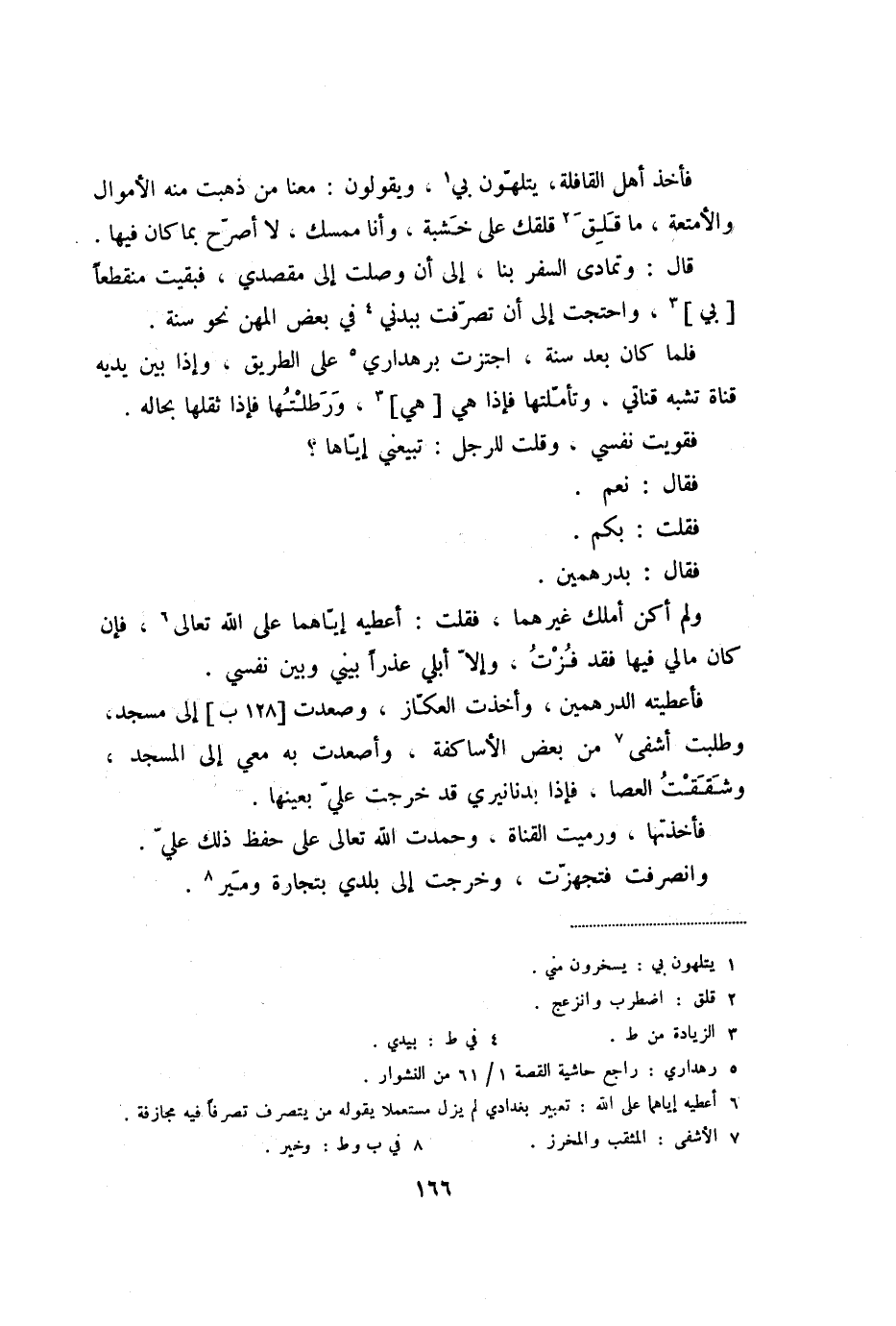 فأعطيته الدرهمين، وأخذت العكّاز، وصعدت [128 ب] إلى مسجد، وطلبت أشفى «8» من بعض الأساكفة، وأصعدت به معي إلى المسجد، وشققت العصا، فإذا بدنانيري قد خرجت عليّ بعينها.