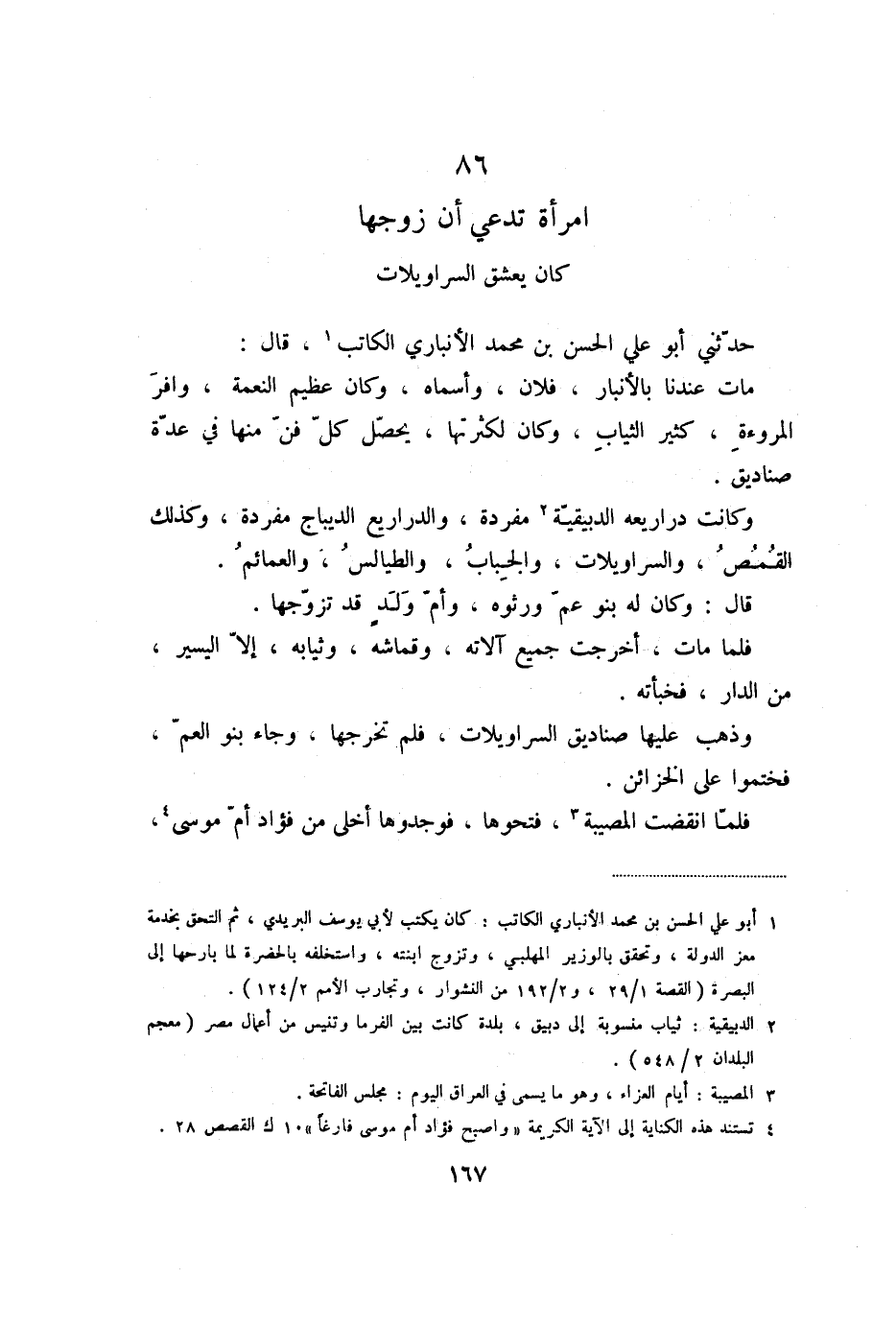 مات عندنا بالأنبار، فلان، وأسماه، وكان عظيم النعمة، وافر المروءة، كثير الثياب، وكان لكثرتها، يحصّل كلّ فنّ منها في عدّة صناديق.