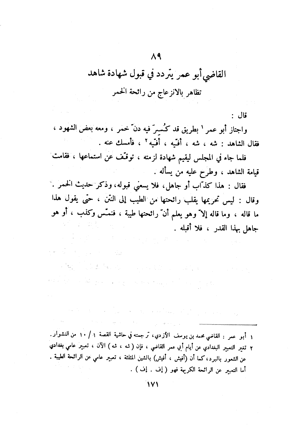 89 القاضي أبو عمر يتردد في قبول شهادة شاهد تظاهر بالانزعاج من رائحة الخمر