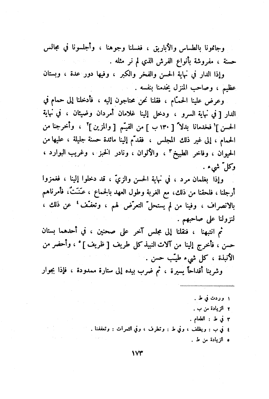 وعرض علينا الحمّام، فقلنا نحن محتاجون إليه، فأدخلنا إلى حمام في الدار [في نهاية السرو، ودخل إلينا غلامان أمردان وضيئان، في نهاية الحسن] «1» فخدمانا بدلا [130 ب] من القيّم [والمزين] «2» ، وأخرجنا من الحمام، إلى غير ذلك المجلس، فقدّم إلينا مائدة حسنة جليلة، عليها من الحيوان، وفاخر الطبيخ «3» ، والألوان، ونادر الخبز، وغريب البوارد، وكلّ شيء.