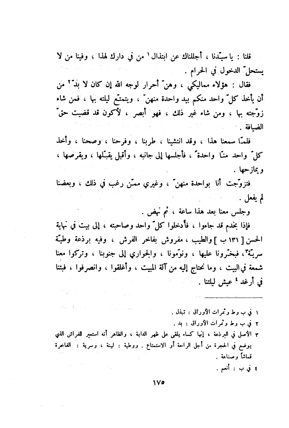 فإذا بخدم قد جاءوا، فأدخلوا كلّ واحد وصاحبته، إلى بيت في نهاية الحسن [131 ب] والطيب، مفروش بفاخر الفرش، وفيه برذعة وطيّة سريّة «3» ، فبخّرونا عليها، ونوّمونا، والجواري إلى جنوبنا، وتركوا معنا شمعة في البيت، وما نحتاج إليه من آلة المبيت، وأغلقوا، وانصرفوا، فبتنا في أرغد «4» عيش ليلتنا.