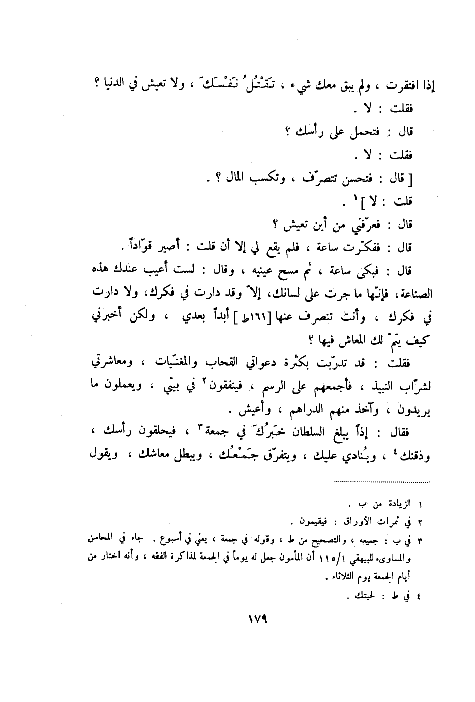 قال: فبكى ساعة، ثم مسح عينيه، وقال: لست أعيب عندك هذه الصناعة، فإنّها ما جرت على لسانك، إلّا وقد دارت في فكرك، ولا دارت في فكرك، وأنت تنصرف عنها [161 ط] أبدا بعدي، ولكن أخبرني كيف يتمّ لك المعاش فيها؟