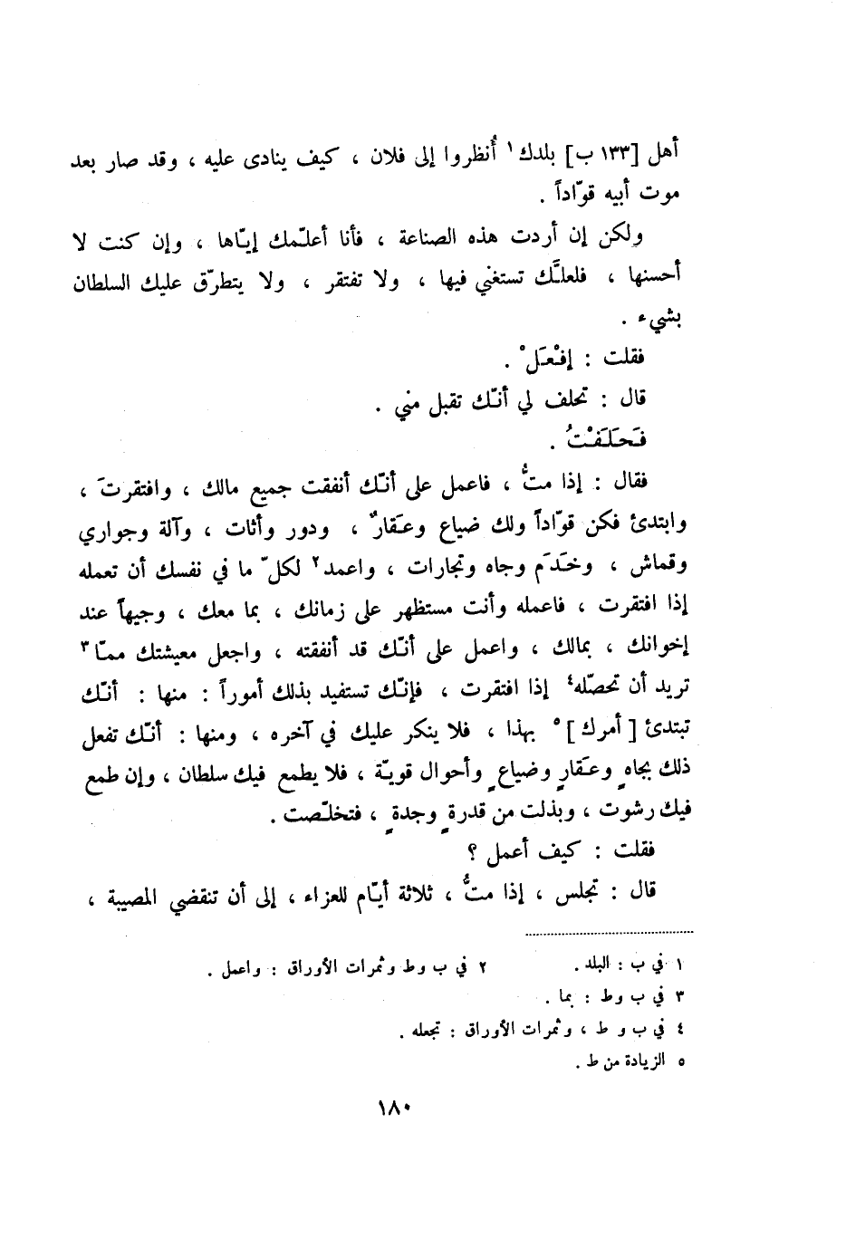 فقال: إذا متّ، فاعمل على أنّك أنفقت جميع مالك، وافتقرت، وابتدئ فكن قوّادا ولك ضياع وعقار، ودور وأثات، وآلة وجواري وقماش، وخدم وجاه وتجارات، واعمد «2» لكلّ ما في نفسك أن تعمله إذا افتقرت، فاعمله وأنت مستظهر على زمانك، بما معك، وجيها عند إخوانك، بمالك، واعمل على أنّك قد أنفقته، واجعل معيشتك ممّا «3» تريد أن تحصّله «4» إذا افتقرت، فإنّك تستفيد بذلك أمورا: منها: أنّك تبتدئ [أمرك] «5» بهذا، فلا ينكر عليك في آخره، ومنها: أنّك تفعل ذلك بجاه وعقار وضياع وأحوال قويّة، فلا يطمع فيك سلطان، وإن طمع فيك رشوت، وبذلت من قدرة وجدة، فتخلّصت.