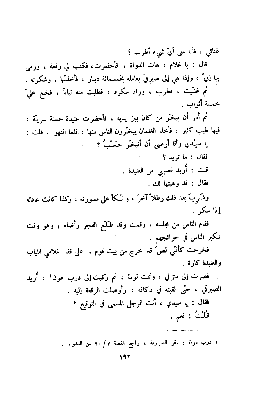 فصرت إلى منزلي، ونمت نومة، ثم ركبت إلى درب عون «1» ، أريد الصيرفي، حتى لقيته في دكانه، وأوصلت الرقعة إليه.