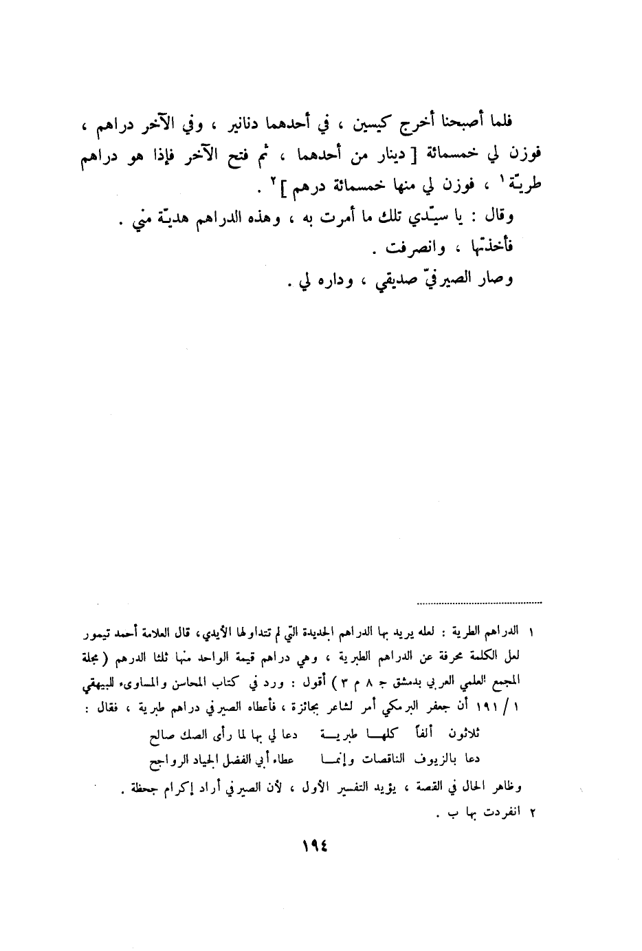 فلما أصبحنا أخرج كيسين، في أحدهما دنانير، وفي الآخر دراهم، فوزن لي خمسمائة [دينار من أحدهما، ثم فتح الآخر فإذا هو دراهم طريّة «1» ، فوزن لي منها خمسمائة درهم] «2» .
