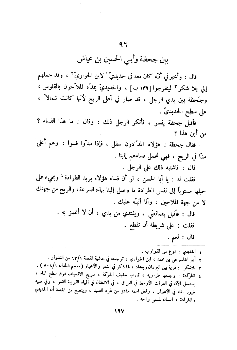 قال: وأخبرني أنّه كان معه في حديديّ «1» لابن الحواريّ «2» ، وقد حملهم إلي بلا شكر «3» ليتفرجوا [139 ب] ، والحديديّ يمدّه الملّاحون بالقلوس، وجحظة بين يدي الرجل، قد صار في أعلى الريح لأنها كانت شمالّا، على سطح الحديديّ.