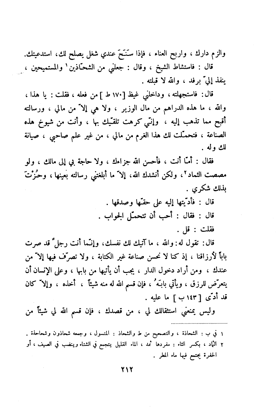 قال: فاستجهلته، وداخلني غيظ [170 ط] من فعله، فقلت: يا هذا، والله، ما هذه الدراهم من مال الوزير، ولا هي إلّا من مالي، ورسالته أقبح مما تذهب إليه، وإنّي كرهت تلقّيك بها، وأنت من شيوخ هذه الصناعة، فتحمّلت لك هذا الغرم من مالي، من غير علم صاحبي، صيانة لك وله.