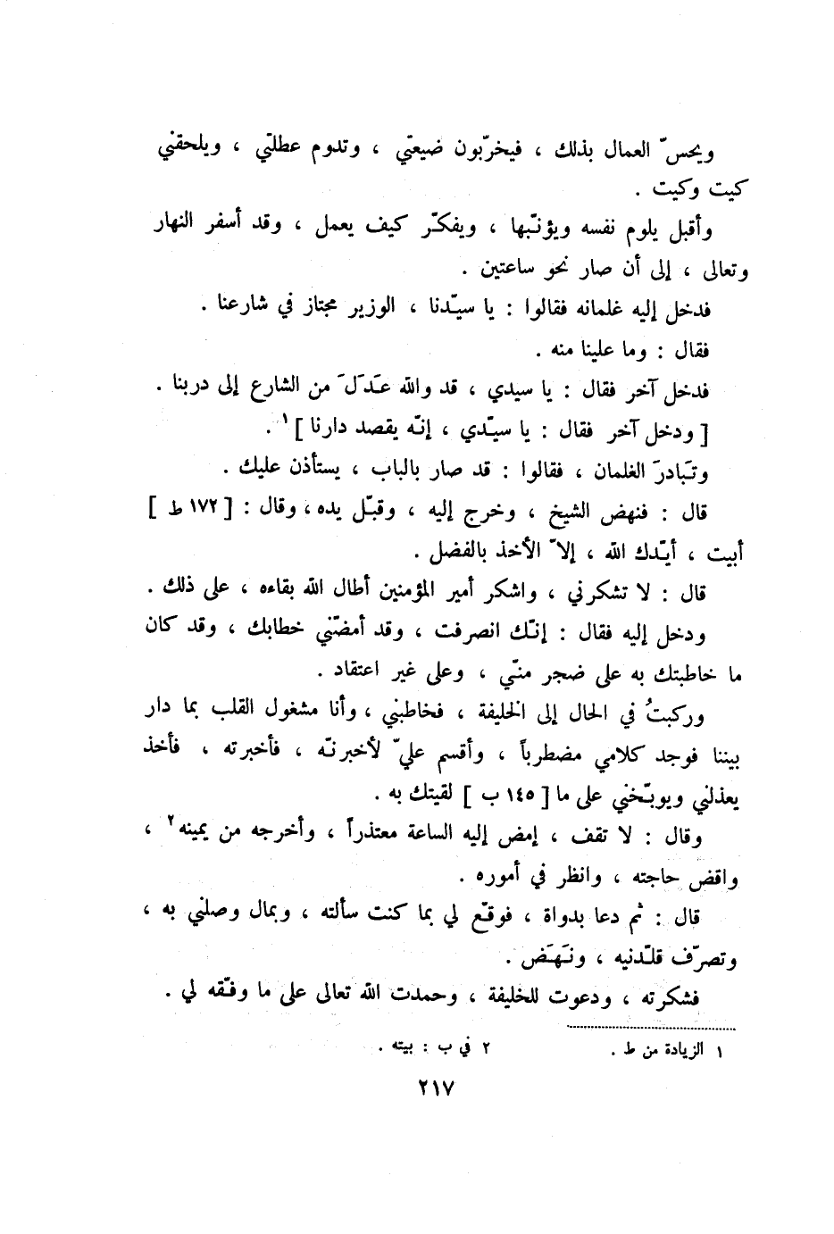 وركبت في الحال إلى الخليفة، فخاطبني، وأنا مشغول القلب بما دار بيننا فوجد كلامي مضطربا، وأقسم عليّ لأخبرنّه، فأخبرته، فأخذ يعذلني ويوبّخني على ما [145 ب] لقيتك به.