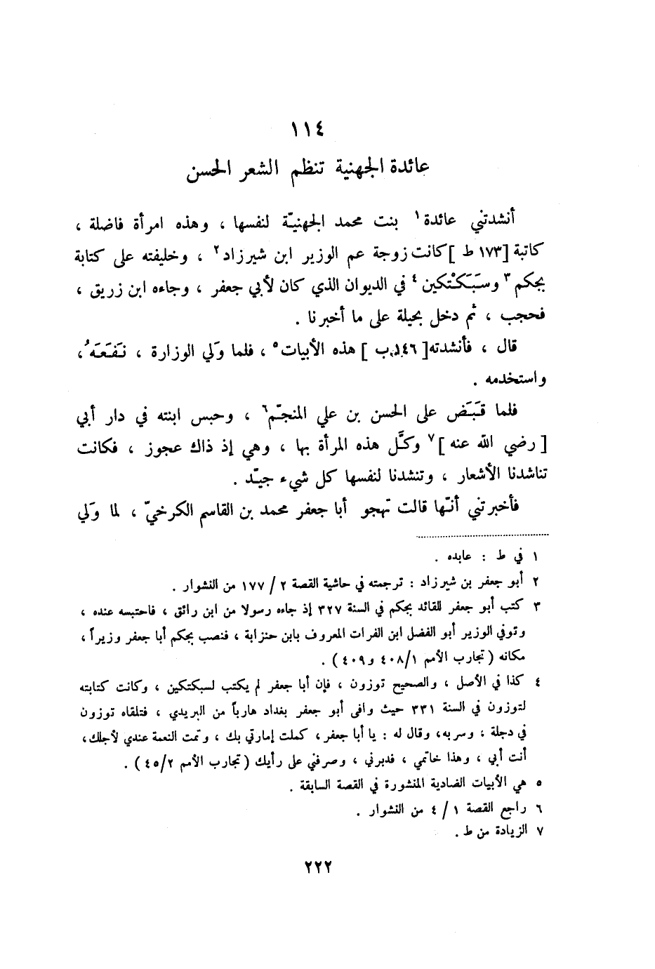 فلما قبض على الحسن بن علي المنجّم «6» ، وحبس ابنته في دار أبي [رضي الله عنه] «7» وكّل هذه المرأة بها، وهي إذ ذاك عجوز، فكانت تناشدنا الأشعار، وتنشدنا لنفسها كل شيء جيّد.