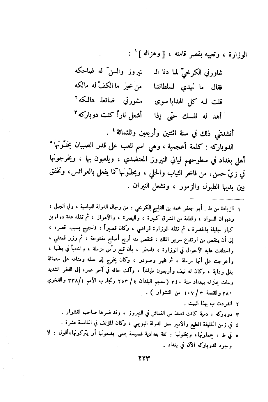 الدوباركه: كلمة أعجمية، وهي اسم للعب على قدر الصبيان يخلّونها «5» أهل بغداد في سطوحهم ليالي النيروز المعتضدي، ويلعبون بها، ويخرجونها في زيّ حسن، من فاخر الثياب والحلي، ويحلّونها كما يفعل بالعرائس، وتخفق بين يديها الطبول والزمور، وتشعل النيران.