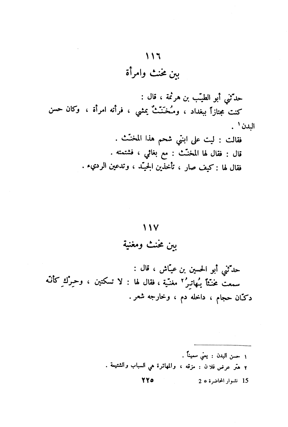 كنت مجتازا ببغداد، ومخنّث يمشي، فرأته امرأة، وكان حسن البدن «1» .