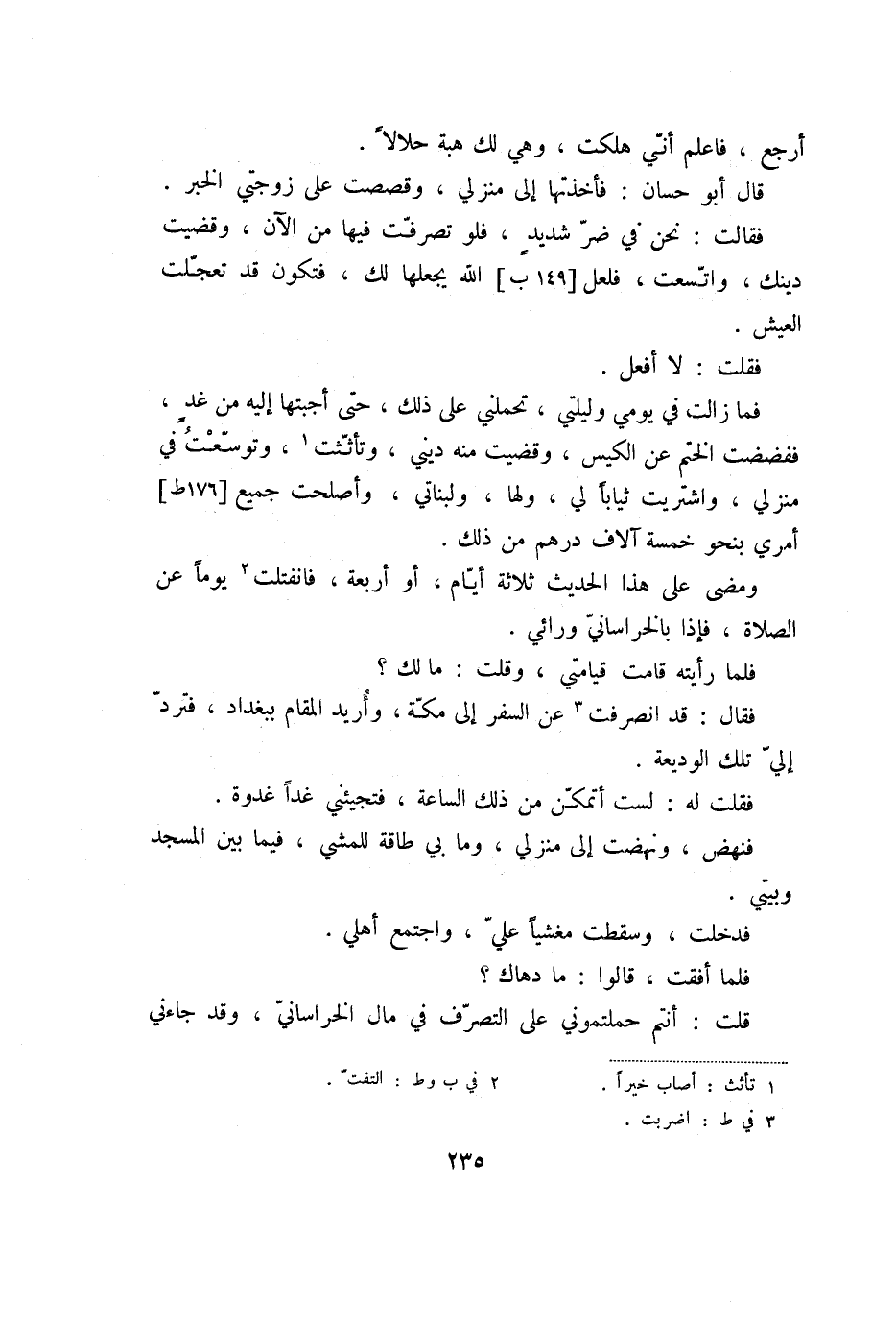 فما زالت في يومي وليلتي، تحملني على ذلك، حتى أجبتها إليه من غد، ففضضت الختم عن الكيس، وقضيت منه ديني، وتأثّثت «1» ، وتوسّعت في منزلي، واشتريت ثيابا لي، ولها، ولبناتي، وأصلحت جميع [176 ط] أمري بنحو خمسة آلاف درهم من ذلك.