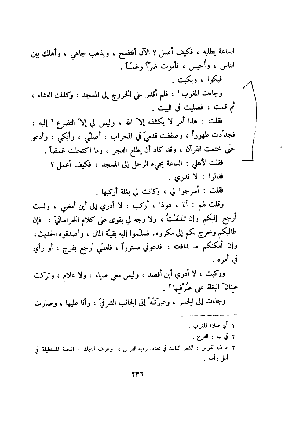 وركبت، لا أدري أين أقصد، وليس معي ضياء، ولا غلام، وتركت عنان البغلة على عرفها «3» .