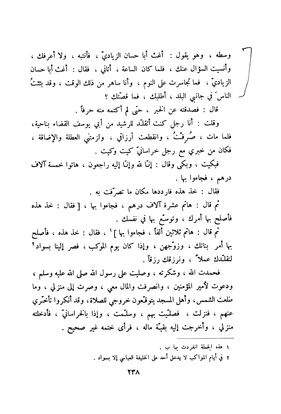 فحمدت الله، وشكرته، وصليت على رسول الله صلى الله عليه وسلم، ودعوت لأمير المؤمنين، وانصرفت والمال معي، وصرت إلى منزلي، وما طلعت الشمس، وأهل المسجد يتوقّعون خروجي للصلاة، وقد أنكروا تأخّري عنهم، فنزلت، فصلّيت بهم، وسلّمت، وإذا بالخراسانيّ، فأدخلته منزلي، وأخرجت إليه بقيّة ماله، فرأى ختمه غير صحيح.