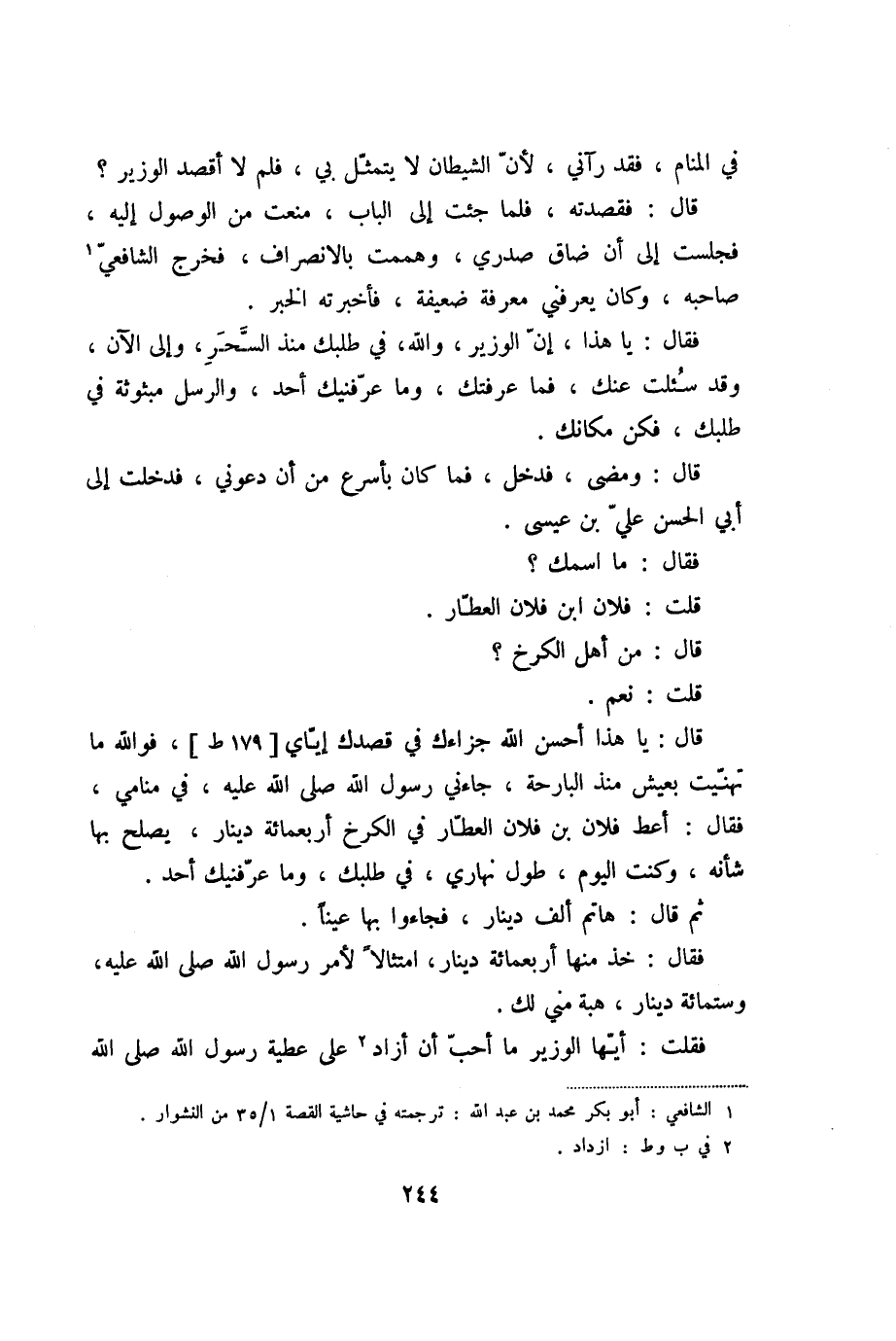 قال: يا هذا أحسن الله جزاءك في قصدك إيّاي [179 ط] ، فو الله ما تهنّيت بعيش منذ البارحة، جاءني رسول الله صلى الله عليه، في منامي، فقال: أعط فلان بن فلان العطّار في الكرخ أربعمائة دينار، يصلح بها شأنه، وكنت اليوم، طول نهاري، في طلبك، وما عرّفنيك أحد.