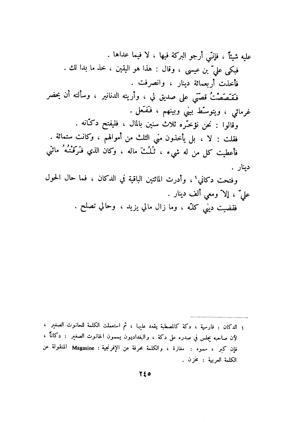 فقصصت قصّتي على صديق لي، وأريته الدنانير، وسألته أن يحضر غرمائي، ويتوسّط بيني وبينهم، ففعل.