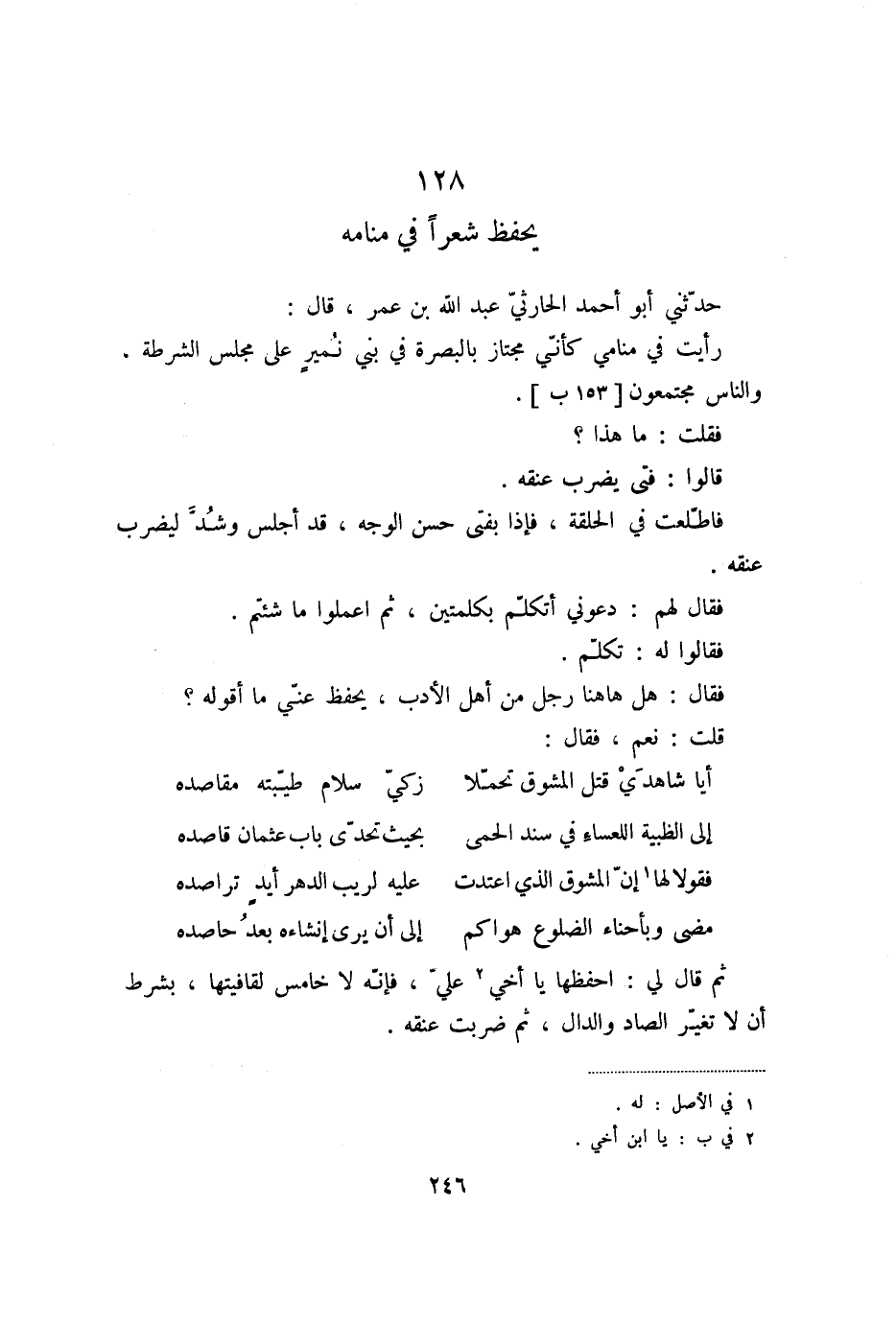 رأيت في منامي كأنّي مجتاز بالبصرة في بني نمير على مجلس الشرطة، والناس مجتمعون [153 ب] .